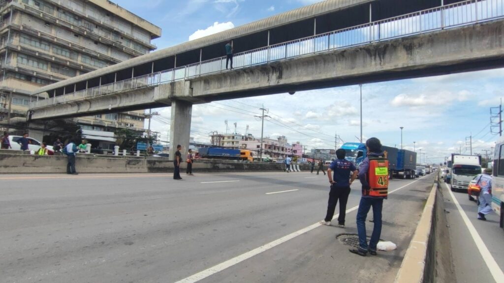 ที่เกิดเหตุพบชายต่างชาติเดินโวยวายอยู่บนสะพานลอยในมือมีกรรไกรอยู่และตามตัวมีบาดแผลที่ทำร้ายตนเองและไม่ให้คนเข้าใกล้เด็ดขาดทางเจ้าหน้าที่ตำรวจจึงกั้นไม่ให้ประชาชนข้ามสะพานลอยเจ้าหน้าที่ตำรวจพยายามเจรจาเพื่อให้ผู้ก่อเหตุเย็นลงแต่ไม่มีท่าทีจะอ่อนลง กระทั่งเจ้าหน้าที่พยายามเดินขึ้นไปด้านบนสะพานลอยเพื่อเจรจาแต่ชายดังกล่าวมีท่าทีหวาดระแวงและเดินออกไปนอกรั้วสะพานลอยด้านนอก เจ้าหน้าที่ตำรวจจราจรต้องมีการปิดการจราจรช่องทางขวาสุดของถนนพหลโยธินขาออก และขาเข้าเพื่อป้องกันอันตรายต่อผู้ใช้เส้นทางรายอื่น หวั่นชายคลุ้มคลั่งกระโดดลงไปขณะรถขับผ่าน ส่งผลให้การจราจรถนนพหลโยธินขาเข้าและออกติดขัดนับ10ก.ม.