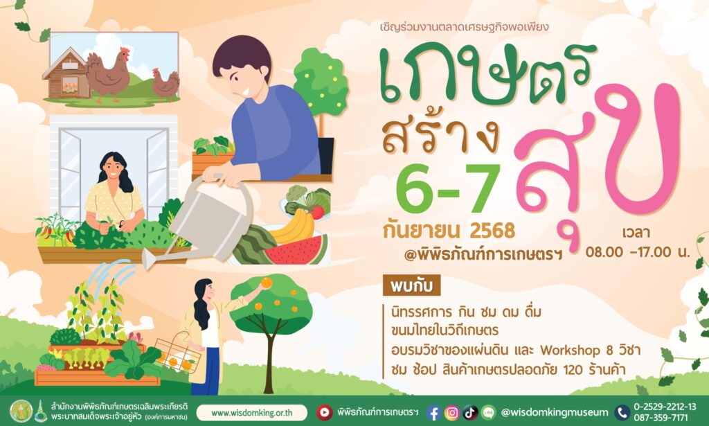 วันที่ 26 สิงหาคม 2568 ผู้สื่อข่าวรายงานว่า พิพิธภัณฑ์การเกษตรเฉลิมพระเกียรติพระบาทสมเด็จพระเจ้าอยู่หัว จังหวัดปทุมธานี เตรียมจัดงานตลาดเศรษฐกิจพอเพียง “เกษตรสร้างสุข” ระหว่างวันที่ 6 – 7 กันยายน 2568 เวลา 08.00 – 17.00 น. เพื่อส่งเสริมแนวทางการเกษตรอย่างมีความสุขและยั่งยืนตามหลักเศรษฐกิจพอเพียง