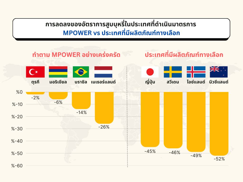 นายสาริษฏ์ฯ เสริมว่า “หากเปรียบเทียบประเทศที่ใช้นโยบาย MPOWER เช่น ตุรกี บราซิล กับประเทศที่อนุญาตให้ผลิตภัณฑ์ทางเลือกถูกกฎหมาย เช่น ญี่ปุ่น สวีเดน และนิวซีแลนด์ การลดลงของอัตราการสูบบุหรี่ในประเทศ 2 กลุ่มนี้ต่างกันมาก ไทยต้องยอมรับว่าเราไม่มีความสามารถในการบังคับใช้กฎหมายได้เท่าสิงคโปร์ เราทุ่มงบประมาณและกำลังพลปราบปรามบุหรี่ไฟฟ้ามาหลายเดือน แต่กลับเห็นบุหรี่เถื่อนและบุหรี่ไฟฟ้าพุ่งสูงขึ้น แม้ว่ารัฐบาลใจใช้มาตรการที่เข้มงวดมากขึ้น แต่ตลาดมืดก็สามารถหาช่องทางและวิธีการใหม่ๆ เพื่อเข้าถึงลูกค้าได้มากขึ้นอยู่ดี รัฐบาลควรจะใช้กำลังพลและงบประมาณเพื่อปราบปรามยาเสพติดร้ายแรงอื่นๆ มากกว่าที่จะมาไล่จับบุหรี่ไฟฟ้าที่เป็นสินค้าถูกกฎหมายในประเทศส่วนใหญ่ในโลกไปแล้ว”