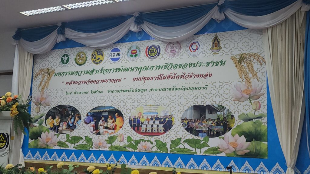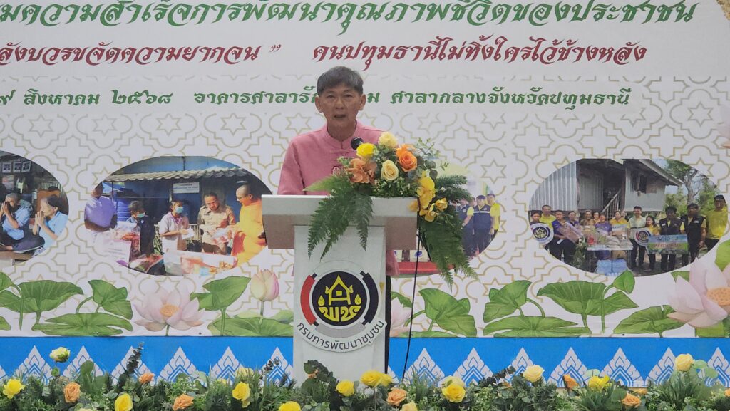 ทั้งนี้ จังหวัดปทุมธานี ได้ขับเคลื่อนการขจัดความยากจนและพัฒนาคนทุกช่วงวัยอย่างยั่งยืนตามหลักปรัชญาของเศรษฐกิจพอเพียง โดยได้จัดตั้งศูนย์อำนวยการฯ ระดับจังหวัด หรือ ศจพ.จ. และระดับอำเภอ หรือ ศจพ.อ. รวมถึงทีมปฏิบัติการ และทีมพี่เลี้ยง เพื่อทำหน้าที่ติดตามดูแลครัวเรือนอย่างใกล้ชิดแบบ Intensive Care โดยใช้ Model “พลังบวรขจัดความยากจน” คนปทุมธานีไม่ทิ้งใครไว้ข้างหลัง เพื่อผนึกกำลังร่วมกับ 7 เครือข่าย แก้ไขปัญหาแบบพุ่งเป้า บูรณาการการช่วยเหลือครัวเรือนยากจนของจังหวัดปทุมธานีให้พ้นสภาพปัญหา และมีคุณภาพชีวิตที่ดีขึ้น