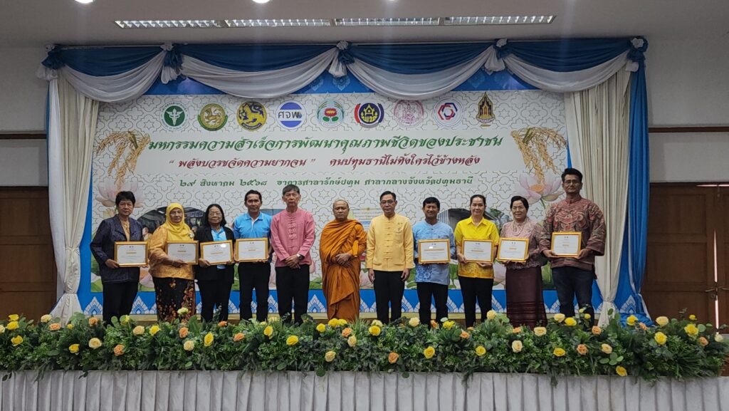 สำนักงานพัฒนาชุมชนจังหวัดปทุมธานี จัดโครงการมหกรรมความสำเร็จการพัฒนาคุณภาพชีวิตของประชาชนขึ้น เพื่อเผยแพร่ผลสำเร็จการพัฒนาคุณภาพชีวิตของประชาชนและเสริมสร้างชุมชนเข้มแข็งเศรษฐกิจฐานรากมั่นคง ส่งเสริมความรู้ ความเข้าใจแนวทางการขับเคลื่อนการพัฒนาคุณภาพชีวิตของประชาชน พร้อมทั้งกระตุ้นความสนใจ เสริมสร้างแรงบันดาลใจในการร่วมมือของทุกภาคส่วนในการพัฒนาคุณภาพชีวิตของประชาชน โดยภายในงานการมีการมอบเกียรติบัตรให้แก่ ข้าราชการ ลูกจ้างประจำ และพนักงานราชการ ดีเด่น กรมพัฒนาชุมชนระดับจังหวัด ประจำปี 2568 จำนวน 5 ราย มอบเกียรติบัตร ให้แก่บุคลากรที่ประพฤติตนเป็นแบบอย่างที่ดีตามคุณธรรมเป้าหมาย 5 ประการ “พอเพียง วินัย สุจริต จิตอาสา กตัญญู” ประจำปีงบประมาณ 2568 จำนวน 5 ราย และมอบเกียรติบัตรกิจกรรมเชิดชูเกียรติงานพัฒนาชุมชน ประจำปี 2568 จำนวน 20 ราย