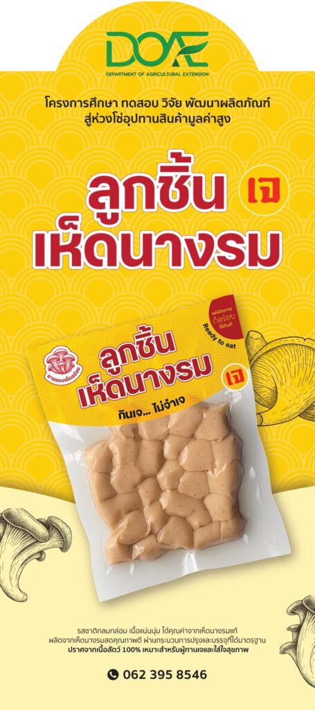 1) “ลูกชิ้นเห็ดนางรมพร้อมรับประทาน” โดย นายศิริชัยวัตร์ พากเพียน เกษตรกรรุ่นใหม่ บริษัทยายแดง