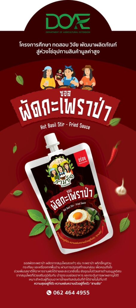 3) “ซอสกะเพราป่าสามซ้อ” โดย นางสาวปาริชาติ บุญอารักษ์ เกษตรกรรุ่นใหม่ กลุ่มเกษตรกรจากอำเภอลำสนธิ จังหวัดลพบุรี