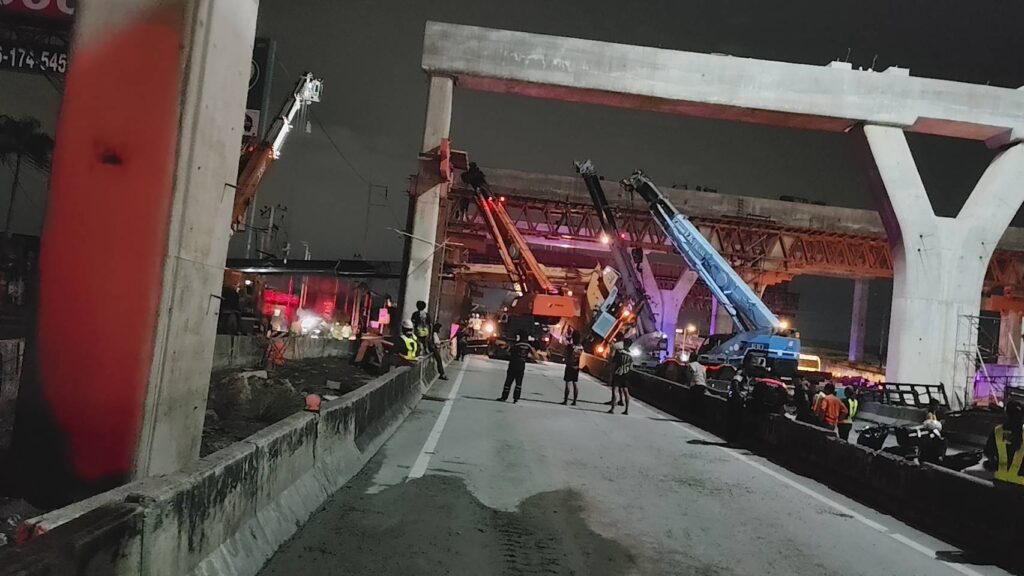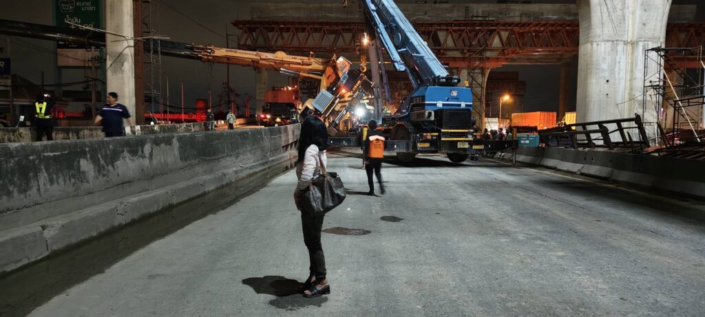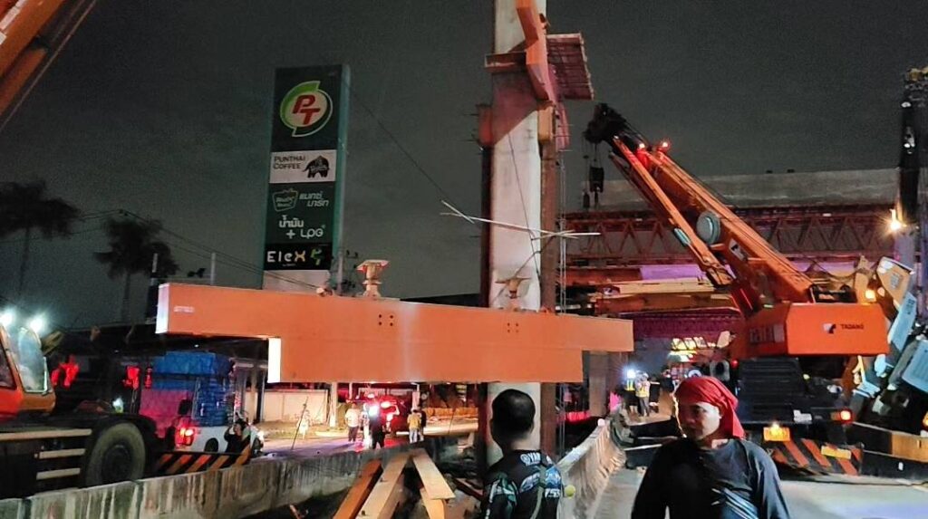 ขณะเดียวกัน รถเครนที่เกิดอุบัติที่ล้มฟาดสายไฟฟ้าแรงสูงช่องคู่ขนาน ตัวแขนเครนได้ไปเกี่ยวสายไฟฟ้า ทำให้เกิดหม้อแปลงที่เสาไฟระเบิดเสียงดังสนั่นไฟลุกทำให้ไฟรัดวงจรช็อตตามสายเจ้าหน้าที่การไฟฟ้าต้องใช้รถกระเช้านำถังดับเพลิงมาฉีดจึงดับ ก่อนตัดกระแสไฟทำให้ไฟฟ้าบริเวณนั้นดับทั้งหมด ขณะเดียวกันทางผู้ควบคุมการก่อสร้างได้นำรถเครนเข้ามาเพื่อยกแท่งเหล็กที่หล่นลงมาออกจากถนน