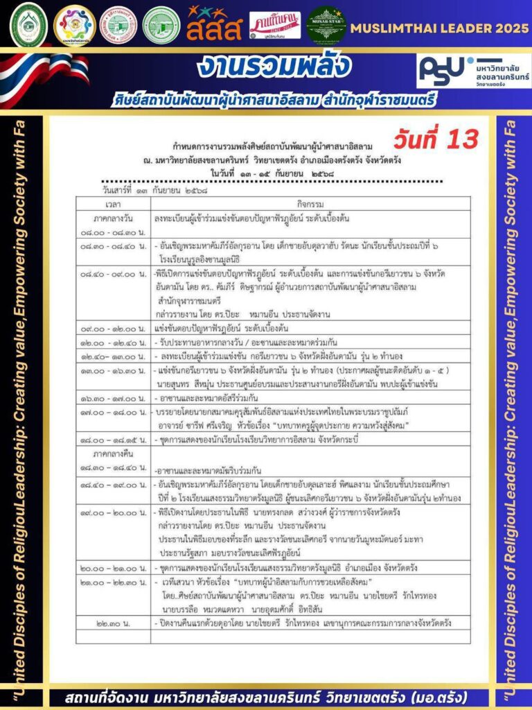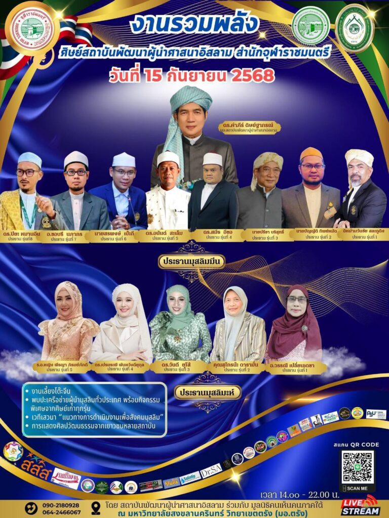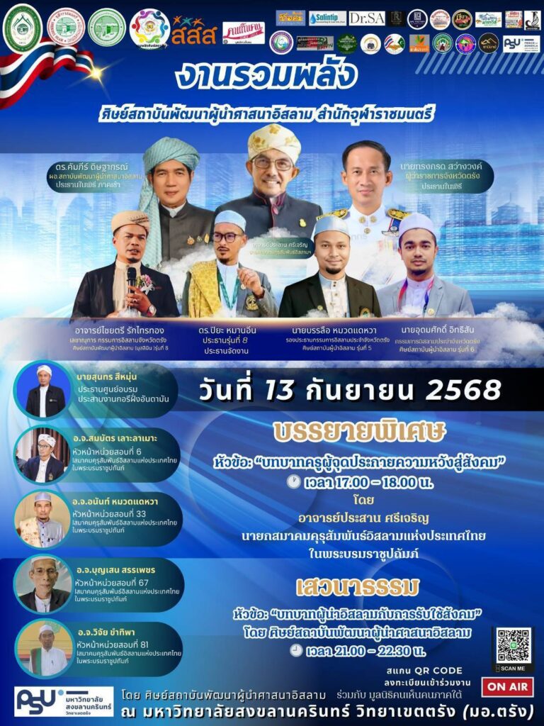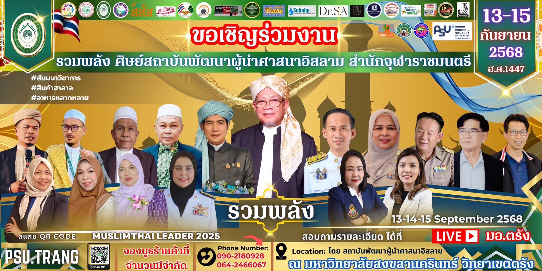 ตรัง – สถาบันพัฒนาผู้นำศาสนาอิสลาม สำนักจุฬาราชมนตรี ร่วมกับ มูลนิธิคนเห็นคนภาคใต้ และเครือข่ายพันธมิตรทั่วประเทศ เตรียมจัดงาน “รวมพลังศิษย์สถาบันพัฒนาผู้นำศาสนาอิสลาม 2568” ระหว่างวันที่ 13 – 15 กันยายน 2568 ณ มหาวิทยาลัยสงขลานครินทร์ วิทยาเขตตรัง