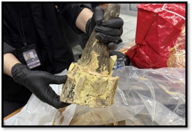 6.86 กิโลกรัม มูลค่าเบื้องต้นประมาณ 6.9 ล้านบาท ซึ่งกรณี เป็นการกระทำความผิดตามพระราชบัญญัติศุลกากร พ.ศ.2560 พระราชบัญญัติสงวนและคุ้มครองสัตว์ป่า พ.ศ.2562 และ พระราชบัญญัติโรคระบาดสัตว์ พ.ศ.2558