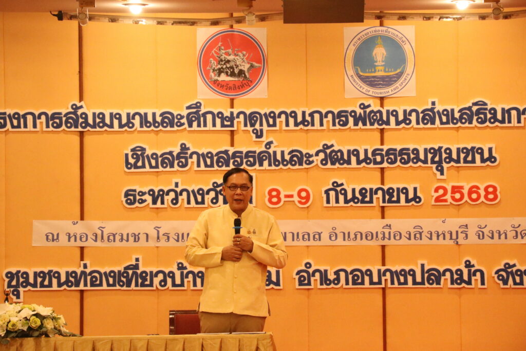 วันจันทร์ที่ 8 กันยายน 2568 นายวราดิศร อ่อนนุช รองผู้ว่าราชการจังหวัดสิงห์บุรี เป็นประธานเปิดโครงการส่งเสริมการท่องเที่ยวเชิงสร้างสรรค์และวัฒนธรรม จังหวัดสิงห์บุรี ภายใต้กิจกรรมสัมมนาและศึกษาดูงาน “การพัฒนาส่งเสริมการท่องเที่ยวเชิงสร้างสรรค์และวัฒนธรรมชุมชน” ณ ห้องประชุมโสมชา โรงแรมไชยแสงพาเลซ อำเภอเมือง จังหวัดสิงห์บุรี