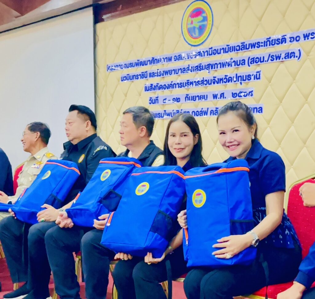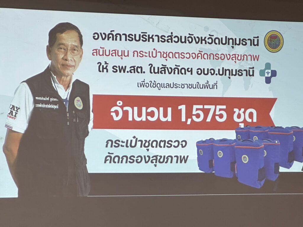 สำหรับการจัดโครงการดังกล่าวนี้ ด้วยองค์การบริหารส่วนจังหวัดปทุมธานี สนับสนุนกระเป๋าชุดตรวจคัดกรองสุขภาพให้เเก่ โรงพยาบาลส่งเสริมสุขภาพตำบลในสังกัดองค์การบริหารส่วนจังหวัดปทุมธานี จำนวน 27 เเห่ง เพื่อใช้ดูแลประชาชนในพื้นที่ ฟื้นฟูองค์ความรู้และทักษะที่จำเป็นแก่อาสาสมัครสาธารณสุข ประจำหมู่บ้าน (อสม.) ให้ทันสมัยในกาปฏิบัติงานอย่างเหมาะสมกับสภาพปัญหา สาธารณสุขของพื้นที่ เพื่อพัฒนาศักยภาพอาสาสมัครสาธารณสุขประจำหมู่บ้าน (อสม.) สามารถนำความรู้ไปพัฒนางานเสริมสร้างทัศนคติและการปฏิบัติงานได้อย่างมีประสิทธิภาพ เตรียมความพร้อมให้กับ อสม. และผู้ปฏิบัติงานในด้านหน่วย บริการสาธารณสุข ที่ถ่ายโอนมายังองค์การบริหารส่วนจังหวัดปทุมธานี ปีงบประมาณ 2569 โดยจัดโครงการในระหว่างวันที่ 8 – 12 กันยายน พ.ศ. 2568 ซึ่งในวันนี้ได้มอบกระเป๋าชุดตรวจสุขภาพให้เเก่โรงพยาบาลส่งเสริมสุขภาพตำบลในสังกัดองค์การบริหารส่วนจังหวัดปทุมธานี จำนวน 6 เเห่ง ได้เเก่ 1. โรงพยาบาลส่งเสริมสุขภาพตำบลคูขวาง 2. โรงพยาบาลส่งเสริมสุขภาพตำบลคลองพระอุดม 3. โรงพยาบาลส่งเสริมสุขภาพตำบลคูบางหลวง หมู่ 1 4. โรงพยาบาลส่งเสริมสุขภาพตำบลคูบางหลวง หมู่ 6 5. โรงพยาบาลส่งเสริมสุขภาพตำบลหน้าไม้ หมู่ 5 6. โรงพยาบาลส่งเสริมสุขภาพตำบลคลองสอง ซึ่งจะ ทยอยมอบจำนวนทั้งหมด 27 แห่ง