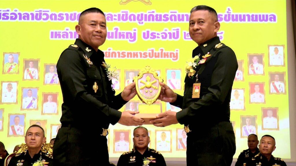 จากนั้น รองผู้บัญชาการทหารบก ได้เป็นผู้แทน ผู้บัญชาการทหารบก กล่าวสดุดีเชิดชูเกียรติ และ มอบของที่ระลึก ให้แก่นายทหารชั้นนายพล เหล่าทหารปืนใหญ่ ทั้ง 44 นาย ที่จะครบเกษียณอายุราชการประจำปี 2568 ในฐานะผู้ทำคุณประโยชน์แก่เหล่าทหารปืนใหญ่ และกองทัพบก อีกทั้ง ยังได้ร่วมกันปกป้องรักษา สถาบันชาติ ศาสนา พระมหากษัตริย์ ให้มีความมั่นคงด้วยดีเสมอมา ณ หอประชุมเอนกประสงค์ ภายในศูนย์การทหารปืนใหญ่ ค่ายภูมพล ต.เขาพระงาม อ.เมือง จ.ลพบุรี โดยมี พลเอก อดินันท์ ไชยฤกษ์ รองปลัดกระทรวงกลาโหม ซึ่งเป็นหนึ่งในผู้ที่จะครบเกษียณอายุราชการ พร้อมด้วย อดีตผู้บังคับบัญชา และเพื่อนข้าราชการเหล่าทหารปืนใหญ่ เข้าร่วมพิธีอย่างพร้อมเพียงกัน