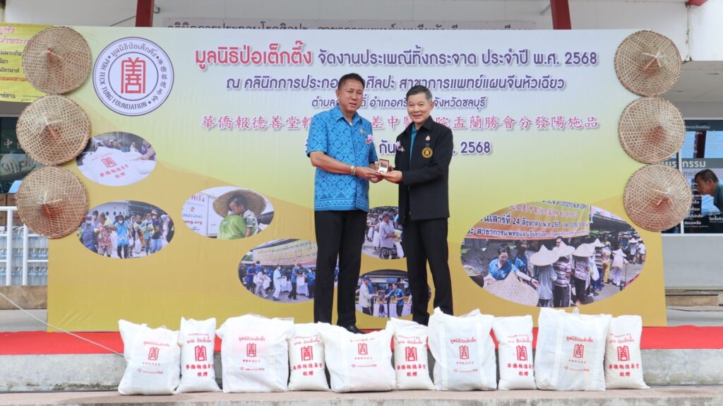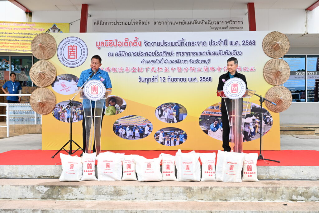 วันนี้ (วันศุกร์ที่ 12 กันยายน พ.ศ. 2568) มูลนิธิป่อเต็กตึ๊ง นำโดย นายวิชิต ชินวงศ์วรกุล รองประธานกรรมการ พร้อมด้วย นายจารุรัตน์ คุณัตถานนท์ กรรมการและเหรัญญิก และ ดร.เสาวนีย์ เตชะไพบูลย์ ภริยาประธานกรรมการ จัดพิธีแจกข้าวสารพร้อมเครื่องอุปโภคบริโภค เนื่องในประเพณีทิ้งกระจาด ประจำปี 2568 ให้กับประชาชนผู้ยากไร้ที่อาศัยอยู่ในพื้นที่ใกล้เคียงคลินิกการประกอบโรคศิลปะ สาขาการแพทย์แผนจีนหัวเฉียว สาขาศรีราชา จำนวน 2,500 ชุด สิ่งของที่แจกประกอบด้วย ข้าวสาร บะหมี่กึ่งสำเร็จรูป ปลากระป๋อง น้ำปลา น้ำมันพืช และขนม บรรจุถุงผ้ามูลนิธิฯ พร้อมมอบค่าพาหนะคนละ 200 บาท ซึ่งในปีนี้จัดค่าพาหนะเพิ่มขึ้นกว่าปีที่ผ่านมา เพื่อเป็นการช่วยเหลือผู้ยากไร้ สอดรับกับค่าครองชีพในปัจจุบันที่เพิ่มขึ้น โดยมี นายธวัชชัย ศรีทอง ผู้ว่าราชการจังหวัดชลบุรี พร้อมด้วย แพทย์จีนสมชาย จิรพินิจวงศ์ รองผู้อำนวยการด้านการแพทย์ คลินิกการประกอบโรคศิลปะ สาขาการแพทย์แผนจีนหัวเฉียว, คณะพุทธสมาคมเพียวเยี้ยงไท้ ศรีราชา, เครือสหพัฒน์, บริษัท แปซิฟิคพาร์ค ศรีราชา จำกัด, บริษัท เบสท์แฟคตอรี่ เอาท์เล็ท จำกัด, สนามกอล์ฟบีเอสซี พร้อมด้วย ผู้แทนจากหน่วยงานภาครัฐในพื้นที่ ร่วมในพิธี ณ บริเวณคลินิกการประกอบโรคศิลปะ สาขาการแพทย์แผนจีนหัวเฉียว สาขาศรีราชา จังหวัดชลบุรี