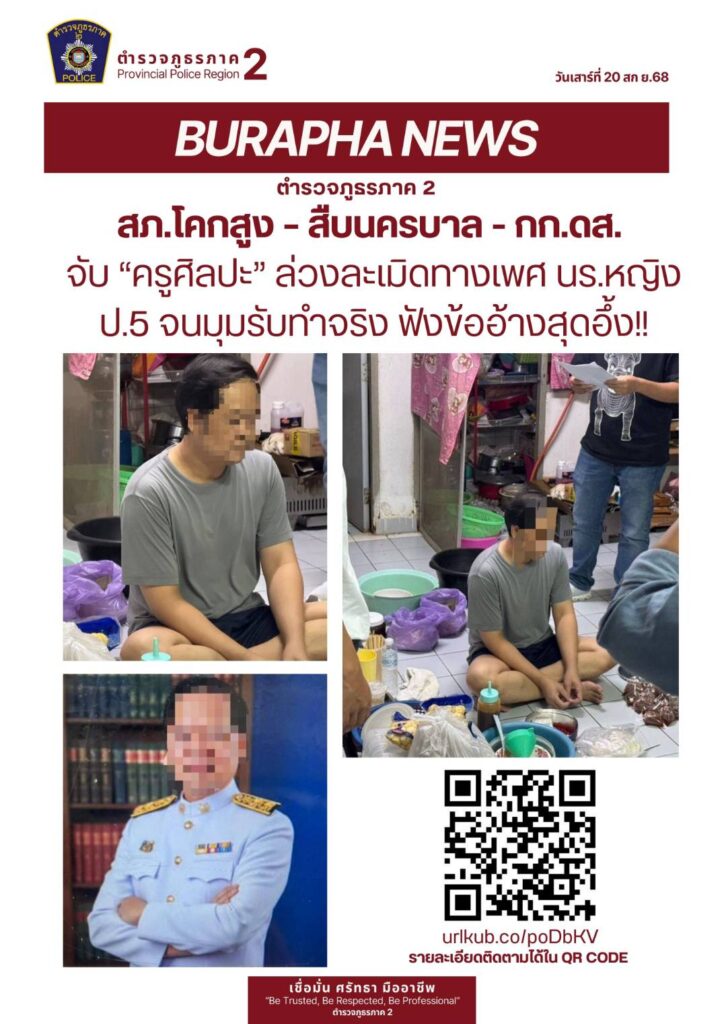 วันที่ 20 กันยายน 2568 : พล.ต.ท.ยิ่งยศ เทพจำนงค์ เปิดเผยว่า เมื่อเวลาประมาณ 17.30 น. วันนี้ (20 กันยายน 2568) พ.ต.อ.สุทธิพงษ์ อินทสิทธิ์ ผกก.สภ.โคกสูง จ.สระแก้ว พร้อมด้วย พ.ต.ท.สกลรัตน์ เขมสวัสดิ์ รอง ผกก.สส.สภ.โคกสูง,พ.ต.ท.หญิง ชาดา เสสะเวช สว.กก.ดส.,พ.ต.ต.ธัญพีรสิษฐ์ จุลพิภพ สว.กก.สส.3 บก.สส.บช.น. ร่วมนำกำลังจับกุมตัวนายสมิท (นามสมมติ) อายุ 49 ปี ข้าราชการครู สอนวิชาศิลปะ ในโรงเรียนแห่งหนึ่งในพื้นที่จังหวัดสระแก้ว ตามหมายจับศาลจังหวัดสระแก้ว ที่ 281/2568 ลงวันที่ 16 กันยายน 2568 ขณะหลบหนีอยู่ที่คอนโดมิเนียมแห่งหนึ่ง ในพื้นที่แขวงบ้านช่างหล่อ เขตบางกอกน้อย กรุงเทพมหานคร โดยสืบสวนสอบสวนพบว่าครูคนนี้ก่อเหตุล่วงละเมิดทางเพศเด็กนักเรียนหญิงชั้น ป.5 โดยการล่อลวงหลายครั้ง ทั้งยังกระทำการรุนแรงจนเด็กได้รับบาดเจ็บทุกข์ทรมานกายและใจจนต้องพักรักษาตัวในโรงพยาบาลร่วมเดือน