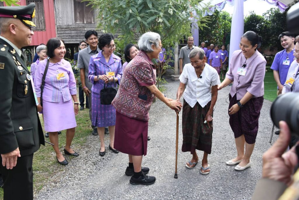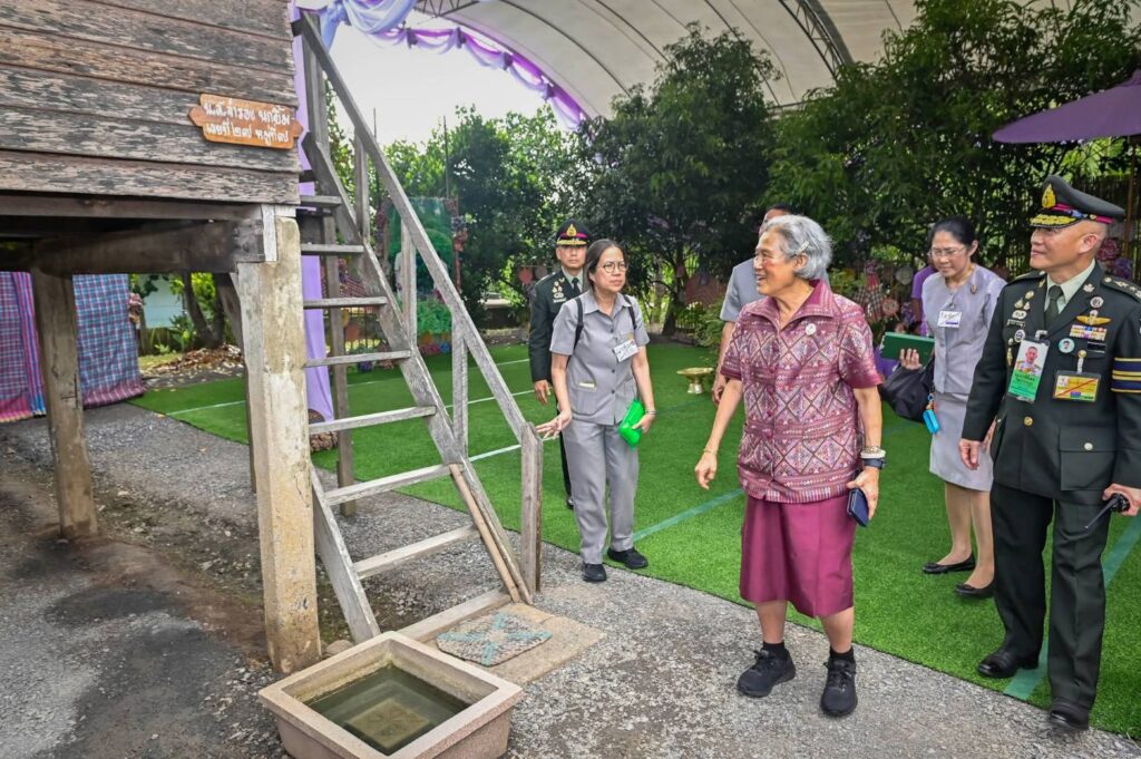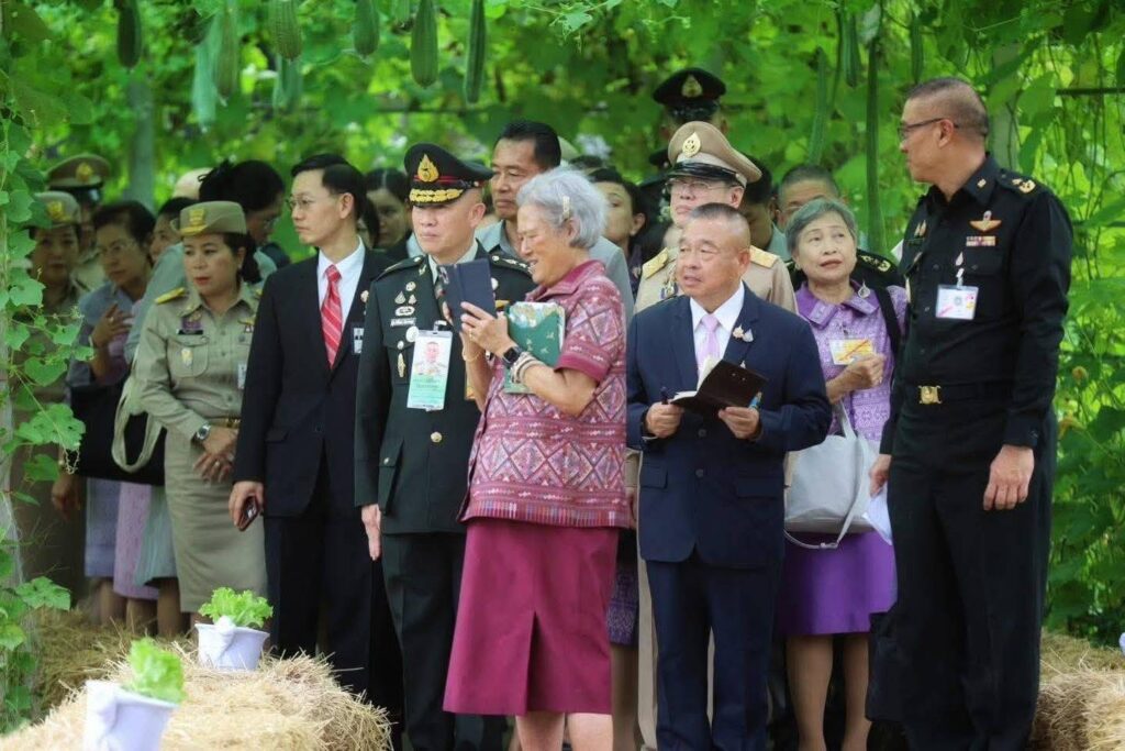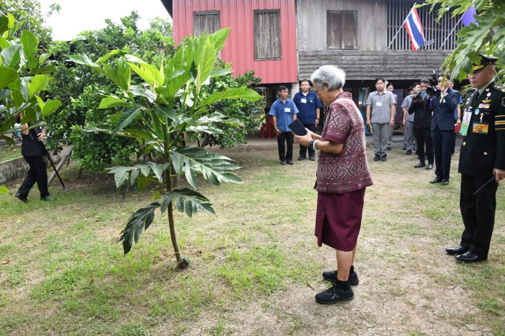 ต่อจากนั้น เสด็จพระราชดำเนินไป บ้านนางสาวจำรอง นกยิ้ม อายุ 97 ปี บ้านเลขที่ 27 บ้านท่ามะขาม หมู่ที่ 7 ตำบลโก่งธนู อำเภอเมือง จังหวัดลพบุรี เป็นสมาชิกโครงการ “บ้านนี้มีรัก ปลูกผักกินเอง” และโครงการ “ทางนี้มีผล ผู้คนรักกัน” ของศูนย์พัฒนาพันธุ์พืชจักรพันธ์เพ็ญศิริ มูลนิธิชัยพัฒนา เข้าร่วมโครงการฯ ในปี 2560 เป็นครัวเรือนต้นแบบผู้สูงอายุของ ตำบลโก่งธนู “ปลูกทุกอย่างที่กิน กินทุกอย่างที่ปลูก” เหลือแบ่งปัน พึ่งพาตนเองได้