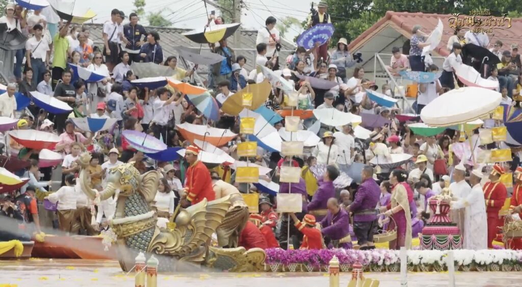 หลังเสร็จสิ้นพิธี ได้มีการโปรยแจก เครื่องบวงสรวง กระยาสารท ข้าวต้มลูกโยน และกล้วย ที่ผ่านการทำพิธีอันเป็นสิริมงคล สร้างปรากฏการณ์ “ร่มหงาย” เมื่อประชาชนและนักท่องเที่ยวต่างหงายร่มเพื่อรับของมงคลกลับบ้าน เชื่อว่าจะนำความโชคดีและความเป็นสิริมงคลมาสู่ครอบครัว