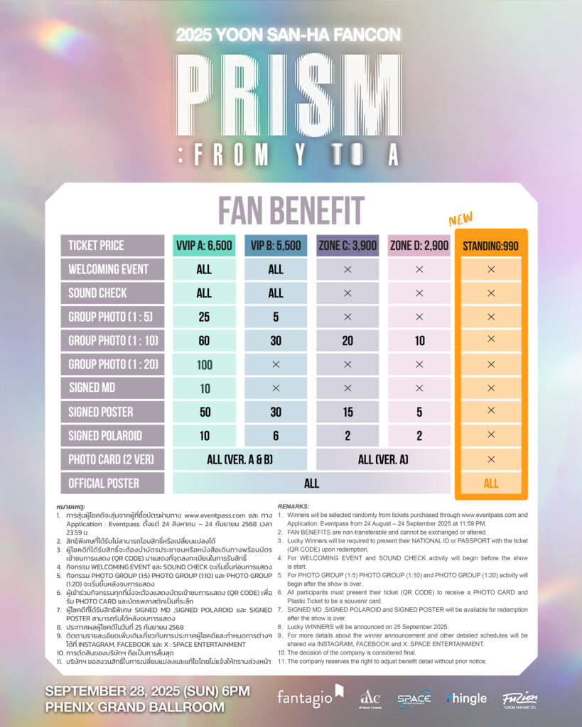 สำหรับใครที่ยังลังเล ผู้จัด สเปซ เอ็นเตอร์เทนเมนต์ (SPACE ENTERTAINMENT) ได้เพิ่มโซนบัตรยืนในราคาย่อมเยาที่ 990 บาท ให้เป็นตัวเลือกสำหรับแฟน ๆ กันอีกด้วย โดยสามารถติดต่อซื้อบัตรยืนดังกล่าวได้ที่ LINE @347dxhcz https://line.me/R/ti/p/@347dxhcz