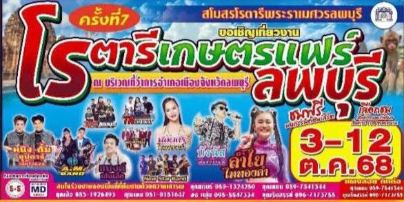 โรตารีเกษตรแฟร์ลพบุรี ครั้งที่ 7 ระยะระหว่างที่ 3 – 12 ตุลาคม 2568 รวมงาน 10 วัน 10 คืน สนใจจะจองร้านติดต่อ บริษัทสามารถ & ศักดิ์ศิริ อินเตอร์กรุ๊ป