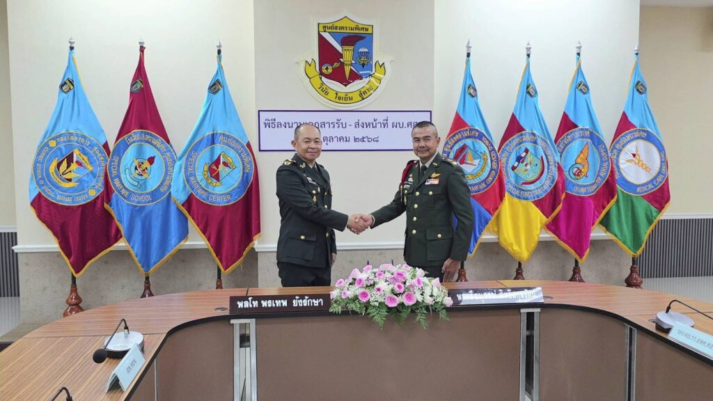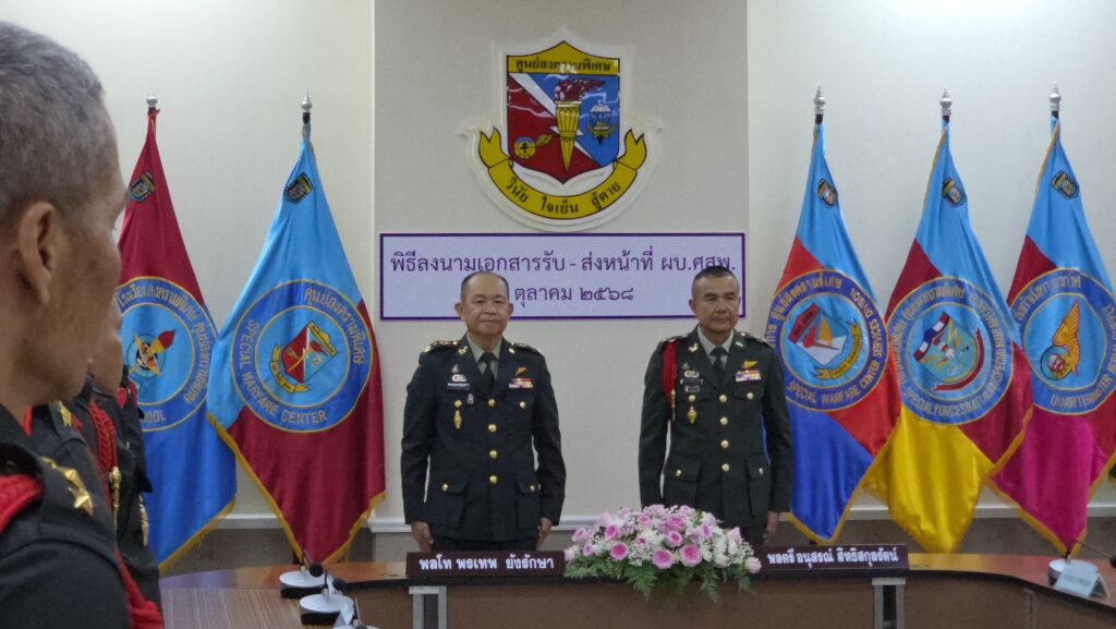 ที่ กองบัญชาการศูนย์สงครามพิเศษ ค่ายสมเด็จพระนารายณ์มหาราช อ.เมือง จ.ลพบุรี พลโท พรเทพ ยังรักษา เจ้ากรมการทหารสื่อสาร ในฐานะอดีต ผู้บัญชาการศูนย์สงครามพิเศษ (ผบ.ศสพ.) ได้กระทำพิธีลงนามในเอกสาร เพื่อส่งมอบการบังคับบัญชา และส่งมอบธงประจำหน่วยให้แก่ พลตรี อนุสรณ์ สิทธิสกุลรัตน์ ตามที่มีพระบรมราชโองการโปรดเกล้า ให้รับราชการในตำแหน่ง ผู้บัญชาการศูนย์สงครามพิเศษ ท่านใหม่ อย่างเป็นทางการ