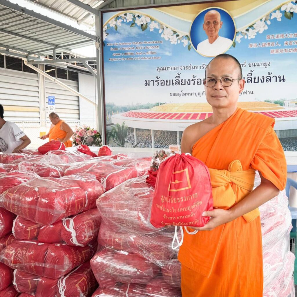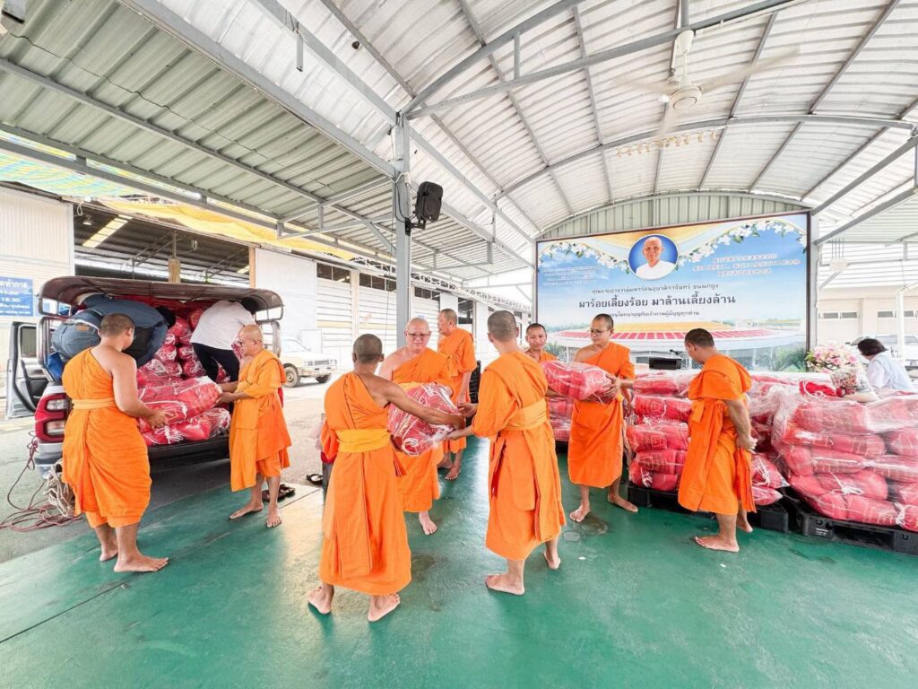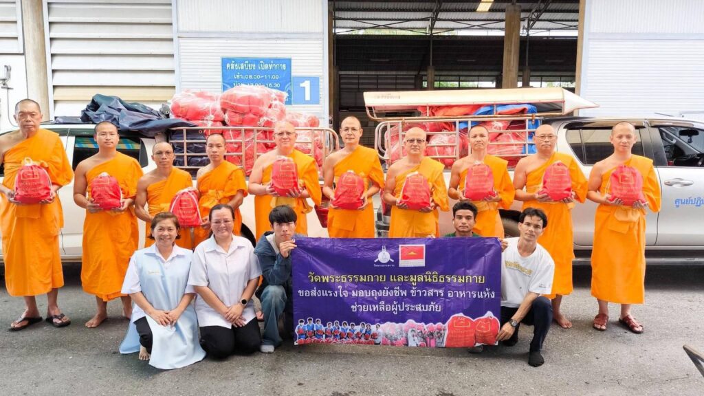 วันที่ 4 ตุลาคม 2568 ณ ศาลามหาทานบารมี อาคารครัว 71 ปี วัดพระธรรมกาย จังหวัดปทุมธานี พระครูปลัดรัตนวีรวัฒน์ เจ้าอาวาสวัดพระธรรมกาย มอบหมายให้พระมหานพพร ปุญฺญชโย ป.ธ.9 ผู้ช่วยเจ้าอาวาสวัดพระธรรมกาย พร้อมด้วยพระธีระพัฒน์ กุลธีโร หัวหน้าสำนักงานประสานงานเครือข่ายภายในประเทศ ผู้แทนมูลนิธิธรรมกาย และคณะศิษยานุศิษย์วัดพระธรรมกาย ส่งมอบถุงยังชีพบรรจุข้าวสารอาหารแห้งจำนวนทั้งสิ้น 600 ชุด รวมเป็นน้ำหนัก 2,100 กิโลกรัม เพื่อนำไปช่วยเหลือคณะสงฆ์และประชาชนผู้ได้รับความเดือดร้อนจากสถานการณ์อุทกภัยในจังหวัดแม่ฮ่องสอน เป็นสาธารณสงเคราะห์