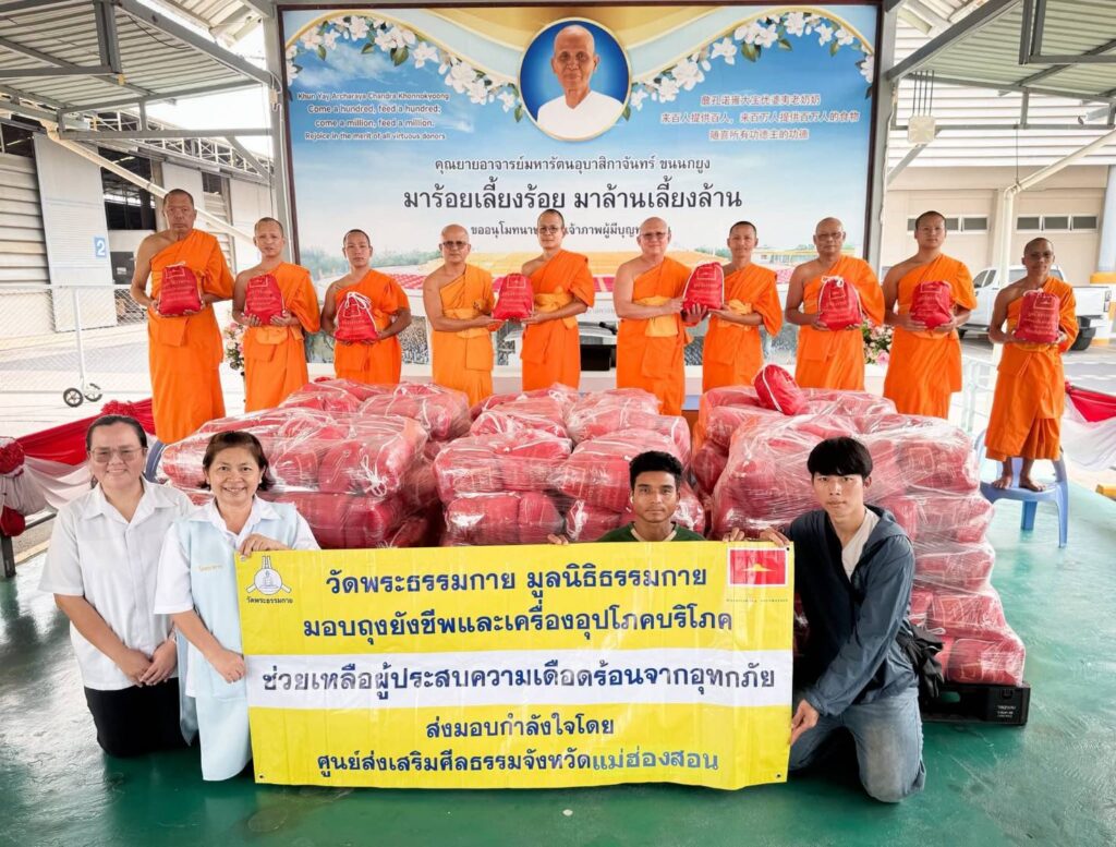 โดยส่งมอบให้กับพระครูวาปีวรมานิต ประธานส่งเสริมศีลธรรมจังหวัดแม่ฮ่องสอน และพระสุรชัย สุรธมฺโม ประธานสงฆ์ศูนย์ปฏิบัติธรรมขุนยวม เพื่อนำลงพื้นที่ช่วยเหลือให้ทันต่อความเดือดร้อนของประชาชนต่อไป ซึ่งกรมป้องกันและบรรเทาสาธารณภัยรายงานว่า สถานการณ์อุทกภัยจากอิทธิพลของพายุ “บัวลอย” เป็นสาเหตุหลักที่ทำให้เกิดฝนตกหนักต่อเนื่อง น้ำป่าไหลหลาก และน้ำล้นตลิ่งในพื้นที่อำเภอสบเมย อำเภอแม่สะเรียง และอำเภอเมือง จังหวัดแม่ฮ่องสอน