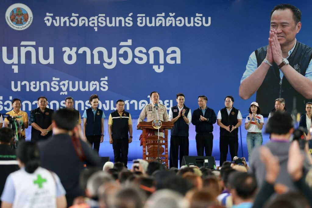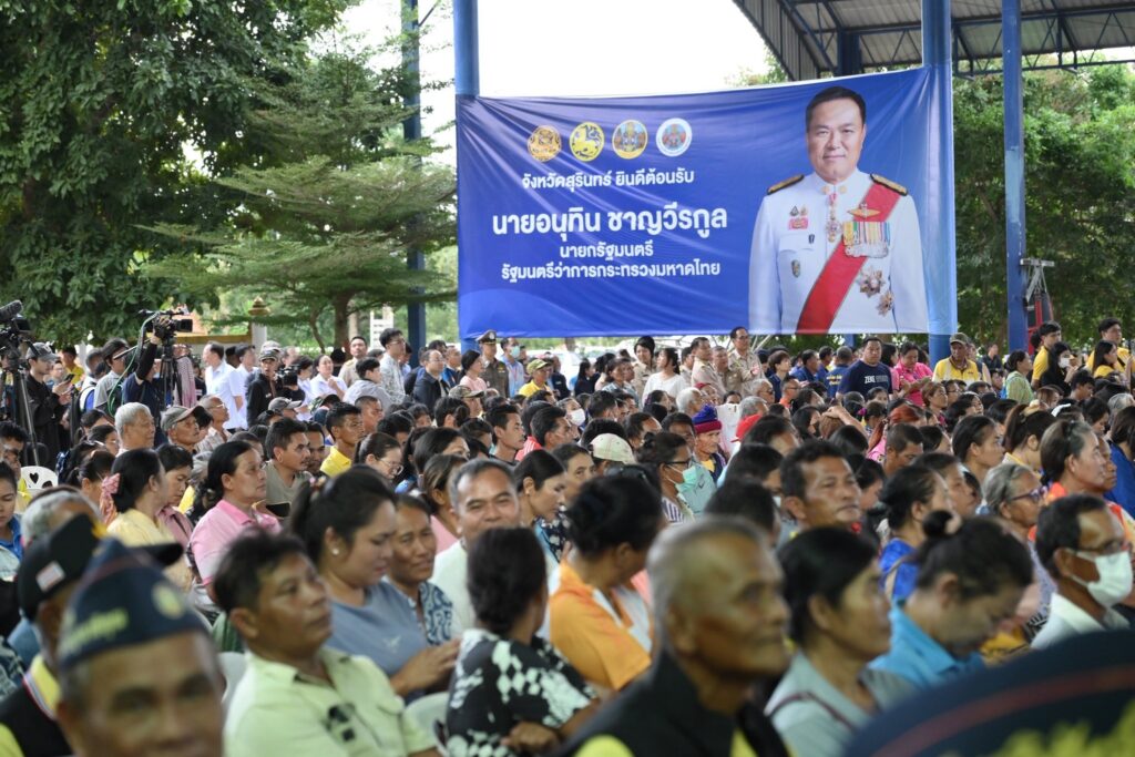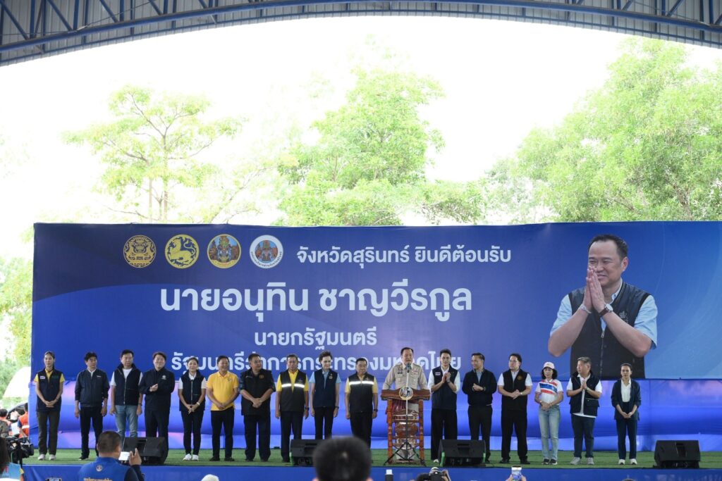 “อนุทิน” ตรวจเยี่ยมให้กำลังใจประชาชนพื้นที่ชายแดนไทย – กัมพูชา ที่ อ.พนมดงรัก จ.สุรินทร์ ย้ำ ทำสิ่งที่ดีที่สุดให้กับพี่น้องประชาชน พร้อมอวยพรให้ประชาชนทุกคนมีแต่ความสุข ในส่วนของความทุกข์ขอให้ส่งมอบให้รัฐบาลทำหน้าที่แก้ปัญหา.วันนี้ (3 ต.ค. 68) เวลา 15.20 น. ที่อาคารโดมโรงเรียนพนมดงรักวิทยา อ.พนมดงรัก จ.สุรินทร์ นายอนุทิน ชาญวีรกูล นายกรัฐมนตรี และ รมว.มหาดไทย ลงพื้นที่ตรวจติดตามการเยียวยาและการให้ความช่วยเหลือผู้ได้รับผลกระทบจากเหตุการณ์ความไม่สงบชายแดนไทย – กัมพูชา ในพื้นที่ จ.สุรินทร์ พร้อมพบปะให้กำลังใจประชาชน โดยมี พล.อ.ณัฐพล นาคพาณิชย์ รมว.กลาโหม นางศุภจี สุธรรมพันธุ์ รมว.พาณิชย์ นายไชยชนก ชิดชอบ รมว.ดิจิทัลเพื่อเศรษฐกิจและสังคม นายพัฒนา พร้อมพัฒน์ รมว.สาธารณสุข นายทรงศักดิ์ ทองศรี รมช.มหาดไทย พล.ท.อดุลย์ บุญธรรมเจริญ รมช.กลาโหม นายวรโชติ สุคนธ์ขจร รมช.สาธารณสุข น.ส.ไตรศุลี ไตรสรณกุล เลขาธิการนายกรัฐมนตรี นายสิริพงศ์ อังคสกุลเกียรติ โฆษกประจำสำนักนายกรัฐมนตรี นายไชยวัฒน์ จุนถิระพงศ์ คณะที่ปรึกษารัฐมนตรีว่าการกระทรวงมหาดไทย พล.อ.อุกฤษฏ์ บุญตานนท์ ผู้บัญชาการทหารสูงสุด นายอรรษิษฐ์ สัมพันธรัตน์ ปลัดกระทรวงมหาดไทย นายพชร อนันตศิลป์ ปลัดกระทรวงดิจิทัลเพื่อเศรษฐกิจและสังคม นายวุฒิไกร ลีวีระพันธุ์ ปลัดกระทรวงพาณิชย์ นพ.สมฤกษ์ จึงสมาน ปลัดกระทรวงสาธารณสุข นายฉัตรชัย บางชวด เลขาธิการสภาความมั่นคงแห่งชาติ นายนฤชา โฆษาศิวิไลซ์ รองหัวหน้าผู้ตรวจราชการกระทรวงมหาดไทย นายนิรัตน์ พงษ์สิทธิถาวร อธิบดีกรมการปกครอง ร.ต.ท.ภพชนก ชลานุเคราะห์ อธิบดีกรมส่งเสริมการปกครองท้องถิ่น นายชัยรัตน์ แก้วเพียงเพ็ญ รองอธิบดีกรมป้องกันและบรรเทาสาธารณภัย พล.ต.อ.สำราญ นวลมา รอง ผบ.ตร. พล.ท.วีระยุทธ รักศิลป์ แม่ทัพภาคที่ 2 นายอนุพงศ์ สุขสมนิตย์ ผู้ว่าราชการจังหวัดศรีสะเกษ นายชำนาญ ชื่นตา ผู้ว่าราชการจังหวัดอุบลราชธานี และนายอนันต์ นาคนิยม ผู้ว่าราชการจังหวัดชัยภูมิ ร่วมลงพื้นที่ โดย นายประภาส ศรีจันทร์เวียง รองผู้ว่าฯ สุรินทร์ รักษาราชการแทนผู้ว่าฯ สุรินทร์ หัวหน้าส่วนราชการ นายอำเภอ ข้าราชการ กำนัน ผู้ใหญ่บ้าน ผู้บริหาร อปท. สมาชิกสภา อปท. สมาชิกกองอาสารักษาดินแดน ชุดรักษาความปลอดภัยหมู่บ้าน อาสาสมัครสาธารณสุขประจำหมู่บ้าน อาสาสมัครป้องกันภัยฝ่ายพลเรือน ทหารผ่านศึก ประชาชนจิตอาสา นักเรียน และประชาชน รวมกว่า 2,000 คน เข้าร่วม.เมื่อนายกรัฐมนตรีเดินทางมาถึง ได้เข้าพบปะทักทายประชาชนที่เดินทางมาให้การต้อนรับ และรับฟังการกล่าวรายง