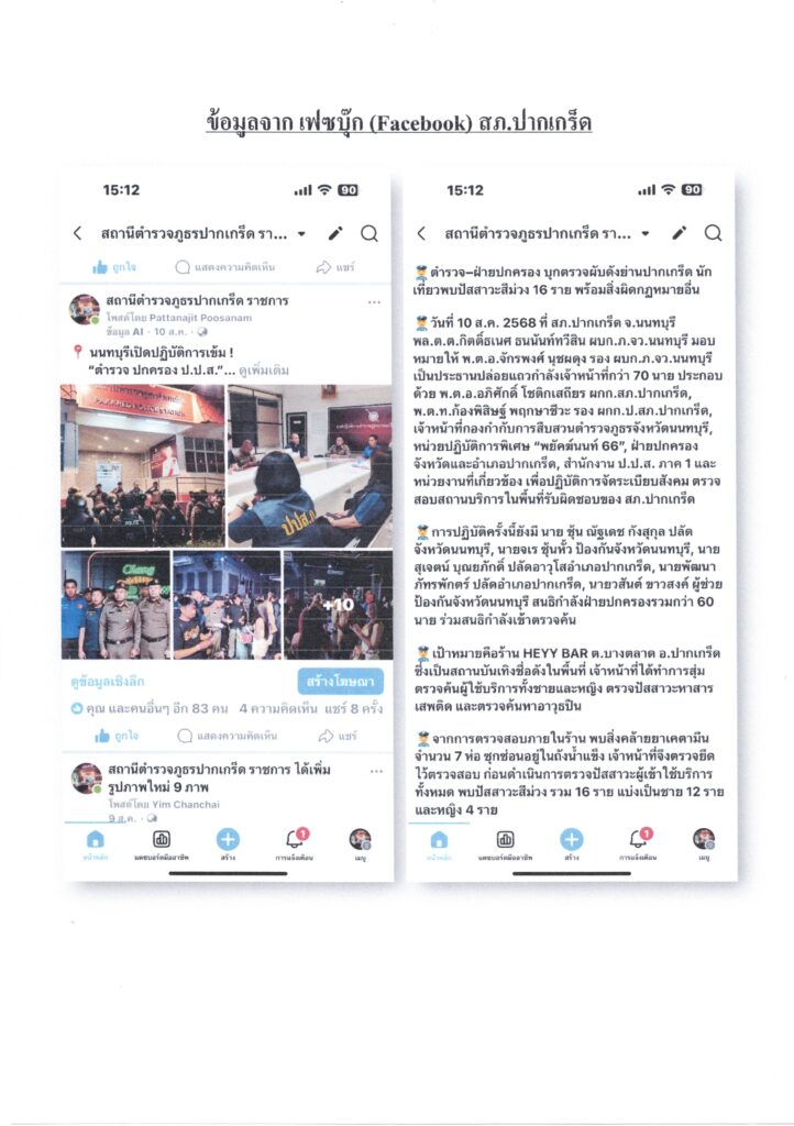 จากเมื่อวันที่ 10 สิงหาคม 2568 สื่อออนไลน์บางสำนักมีการนำเสนอข่าว “จู่โจมบุกผับดัง ย่านปากเกร็ด พบนักเที่ยวกว่า 300 คน เปิดเกินเวลา ยาเสพติดตกเกลื่อนร้าน”โดยเนื้อหาข่าวดังกล่าวแสดง ถึงการเข้าปฏิบัติที่มีแต่ฝ่ายปกครองเพียงหน่วยเดียว ซึ่งมีความคลาดเคลื่อนจากข้อเท็จจริง อันอาจนำมาซึ่งความเข้าใจผิดของประชาชนทั่วไปในการรับข้อมูลข่าวสาร อาจส่งผลเสียต่อภาพลักษณ์ขององค์กรได้