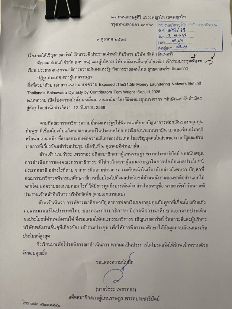 ดีเวลลอปเมนท์ จำกัด (มหาชน) และผู้บริหารบริษัทพลังงานอื่นๆที่เกี่ยวข้อง เข้าร่วมประชุมชี้แจง หนังสือระบุว่าตามที่คณะกรรมาธิการความมั่นคงแห่งรัฐฯ ได้พิจารณาศึกษาปัญหาการฟอกเงินของกลุ่มทุนกัมพูชาที่เชื่อมโยงกับแก๊งคอลเซนเตอร์ในประเทศไทย กรณีของนายเบนจามิน เมาเออร์เบอร์เกอร์ หรือนายเบน สมิธ ที่ส่งผลกระทบต่อความมั่นคงของประเทศ โดยเชิญบุคคลในส่วนของภาครัฐและส่วนราชการที่เกี่ยวข้องเข้าร่วมประชุม