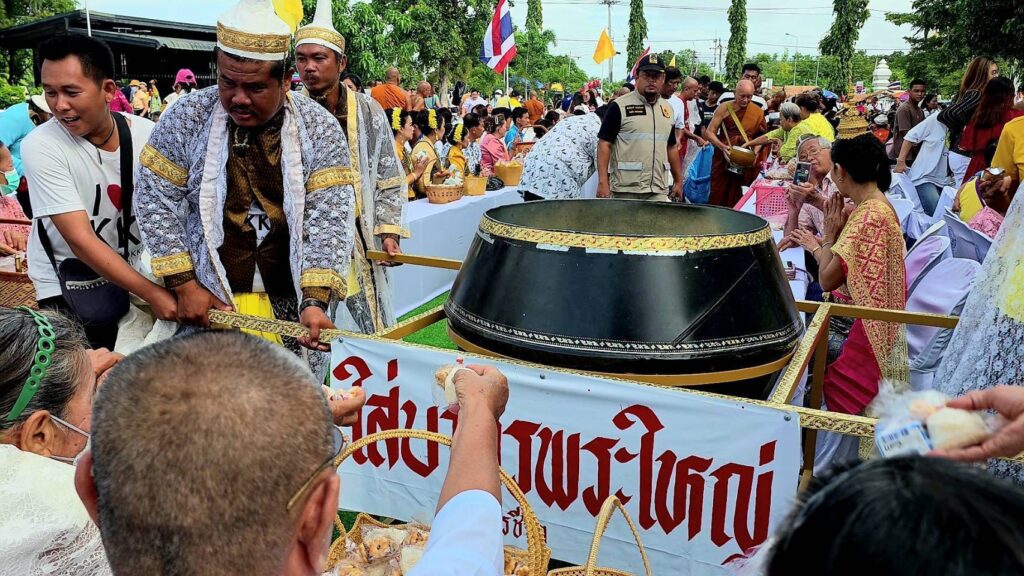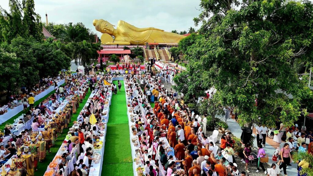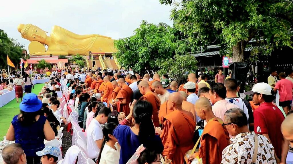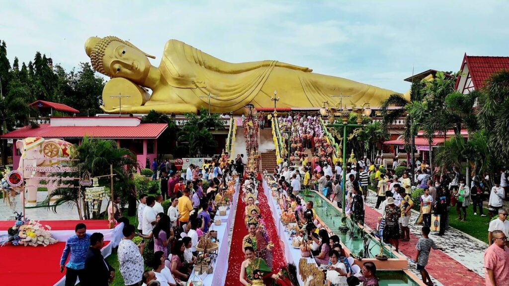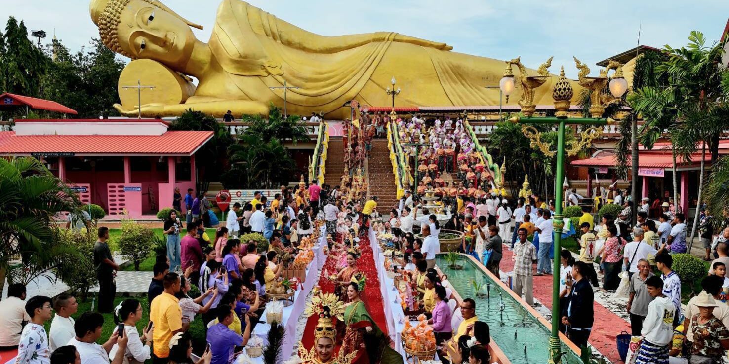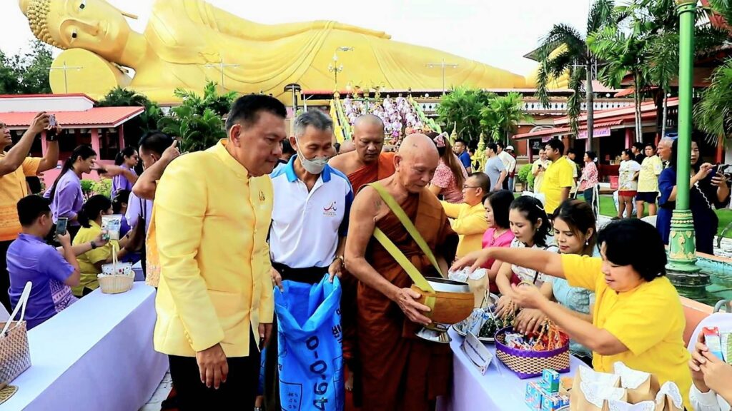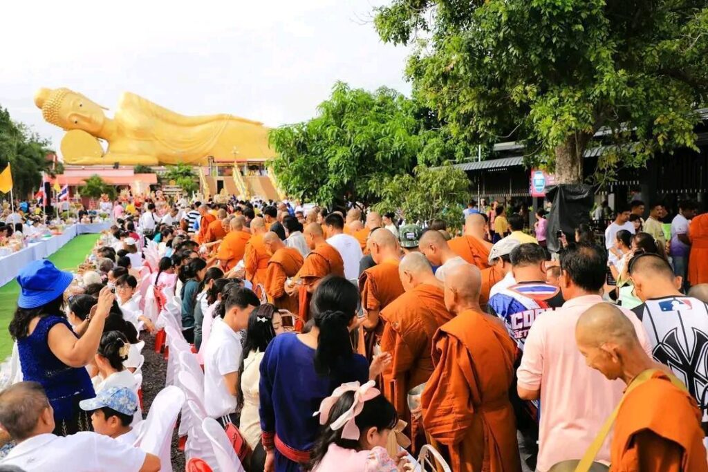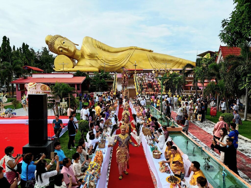 ซึ่งการจัดงานในปีนี้ ได้จัดรูปขบวนให้มีผู้แต่งกายเป็น เทวดา พระอินทร์ นางฟ้า เดินนำพระสงฆ์ ลงมาจาก พระพุทธไสยาสน์องค์ใหญ่ที่สุดของจังหวัดลพบุรี ที่มีความยาว 45 เมตร กว้าง 4 เมตร และสูง 16 เมตร ซึ่งเป็นที่เลื่อมใสศรัทธาขอพุทธศาสนิกชนทั่วไปรวมถึงเป็นการส่งเสริมการท่องเที่ยวตามวิถีไทย วิถีพุทธ เนื่องในเทศกาลวันออกพรรษา ซึ่งพระสงฆ์ ได้เดินลงเพื่อมารับบิณฑบาตจากพุทธศาสนิกชนที่มายืนรอใส่บาตรกันอย่างเนื่องแน่น โดนที่ก่อนเริ่มงานสายฝนได้ตกโปรยปรายลงมา พุทธศาสนิกชนบางรายต้องกางร่ม สวมเสื้อกันฝน และบางรายเอาถุงพลาสติกคลุมหัว แต่ทุกคนต่างแสดงออกถึงความตั้งใจที่จะร่วมทำบุญเพื่อความเป็นสิริมงคลให้แก่ตนเองและครอบครัวเนื่องในเทศกาลวันออกพรรษาอีกด้วย