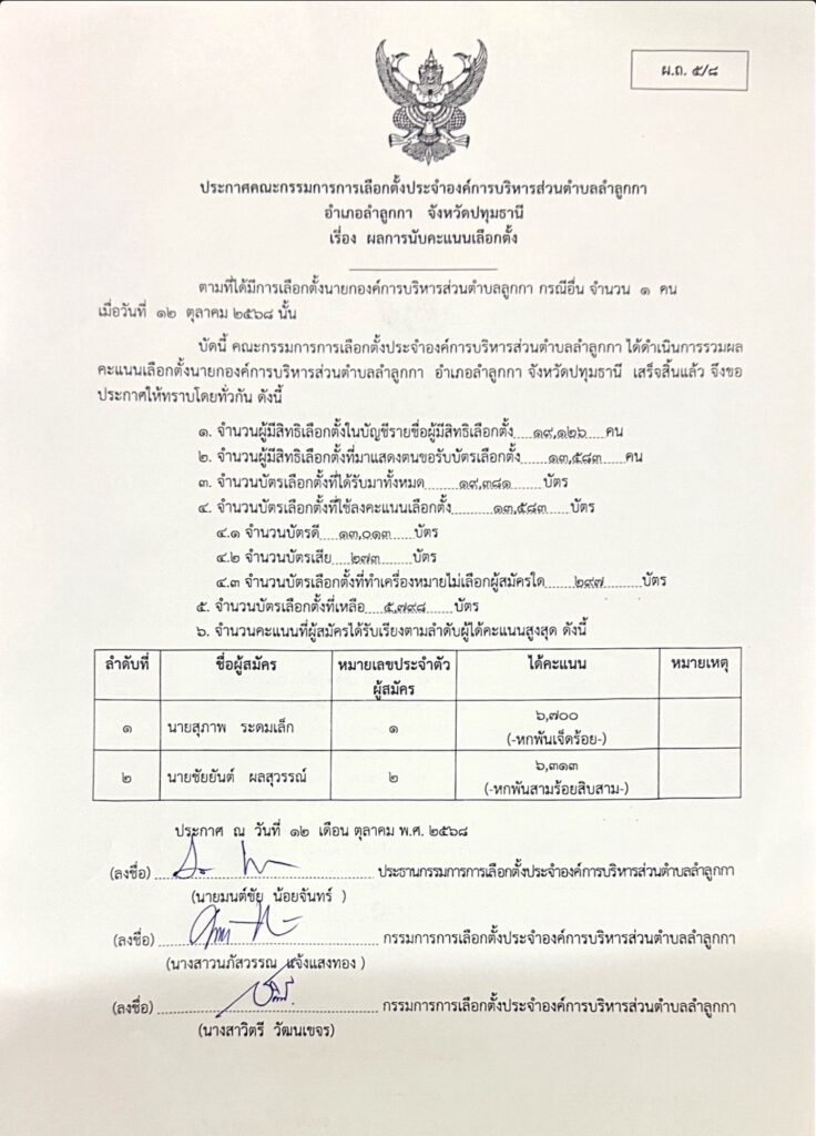 โดยที่ ที่ทำการ เลือกตั้งของ นายสุภาพ ระดมเล็ก ผู้สมัครนายก อบต.ลำลูกกา หมายเลข 1 มี พล.ต.ท.คำรณวิทย์ ธูปกระจ่าง นายก อบจ.ปทุมธานี ร้อยตำรวจเอก ดร.ตรีลุพธ์ ธูปกระจ่าง นายกเทศมนตรีนครรังสิต นายรังสรรค์ นันทกาวงศ์ นายกเทศมนตรีเมืองบึงยี่โถ และทีมงานหาเสียงของ นายสุภาพ ระดมเล็ก ผู้สมัครนายก อบต.ลำลูกกา หมายเลข 1 เท่านั้นไม่อณุญาติ ให้บุคคลภายนอกเข้ามา ร่วมลุ้นผลการเลือกตั้ง หลังจากที่คะแนนอย่างไม่เป็นทางการปรากฏว่า นายสุภาพ ระดมเล็ก ผู้สมัครนายก อบต.ลำลูกกา หมายเลข 1 ชนะการเลือกตั้ง ด้วยคะแนน6700 ส่วนนายชัยยันต์ ผลสุวรรณ์เบอร์2 ได้6313 คะแนน จากผู้มีสิทธิเลือกตั้งทั้งหมด 19,126 คน เป็นนายก อบต.ลำลูกกา คนใหม่ และถือว่าป้องกันแชมป์ ได้สำเร็จ ทุกคนแสดงความยินดีขอร้องกับชัยชนะ ทาง นายสุภาพ ได้ไหว้ ขอบคุณพล.ต.ท.คำรณวิทย์ ธูปกระจ่าง นายก อบจ.ปทุมธานี