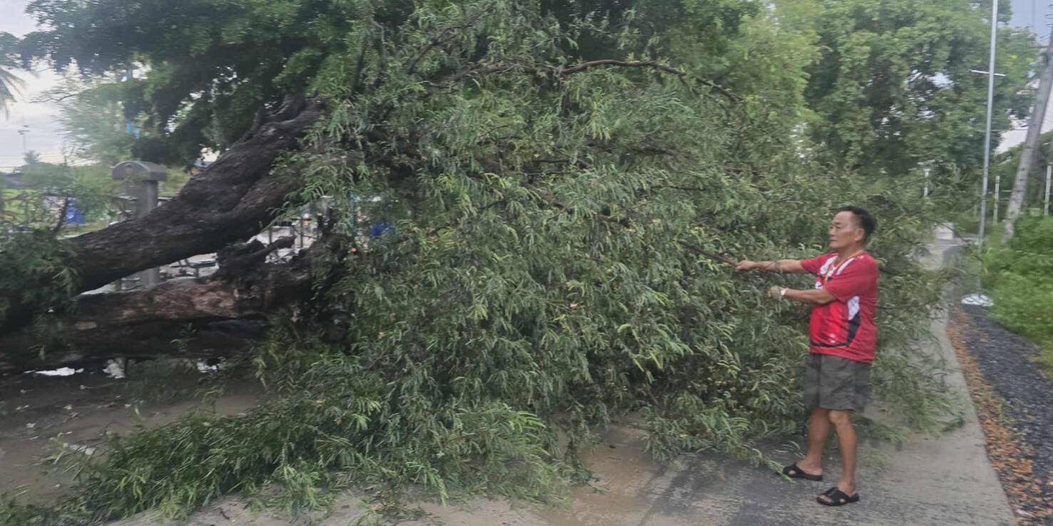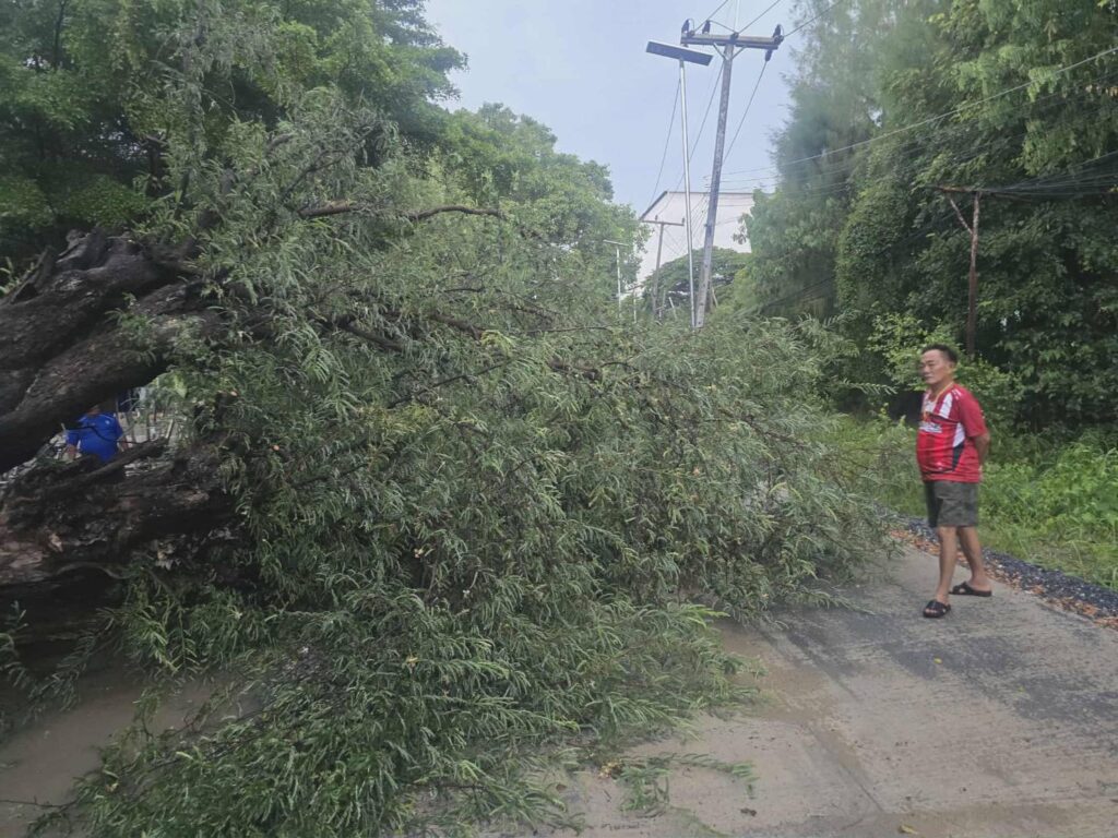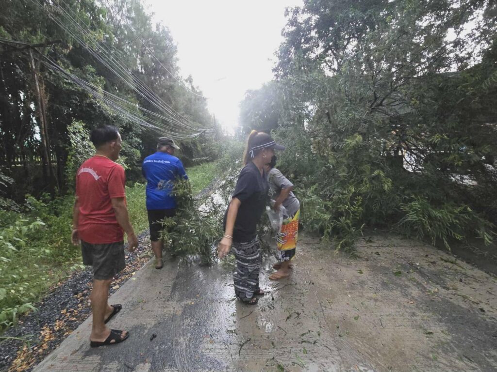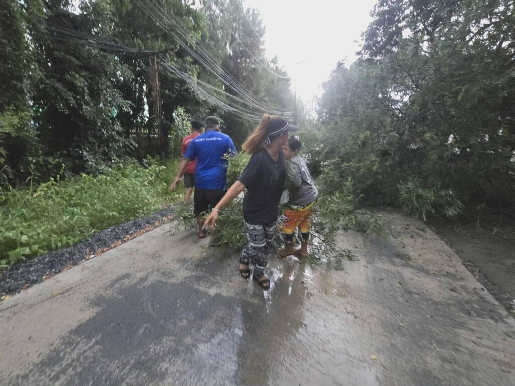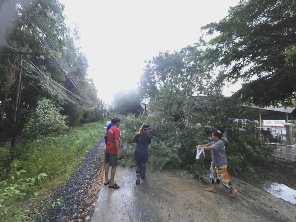 รับแจ้งว่ามีต้นไม้ล้มหมู่ที่ 5 บ้านหนองทรายขาว บริเวณข้างโดมวัดหนองทรายขาว และกีดขวางการจราจร เนื่องจากมีลมพัดรางและฝนตกหนัก) ได้พาทีมงานพี่น้องชาวบ้านหนองทรายขาว ช่วยกันตัดกิ่งไม้
