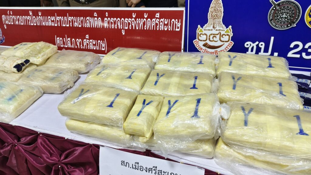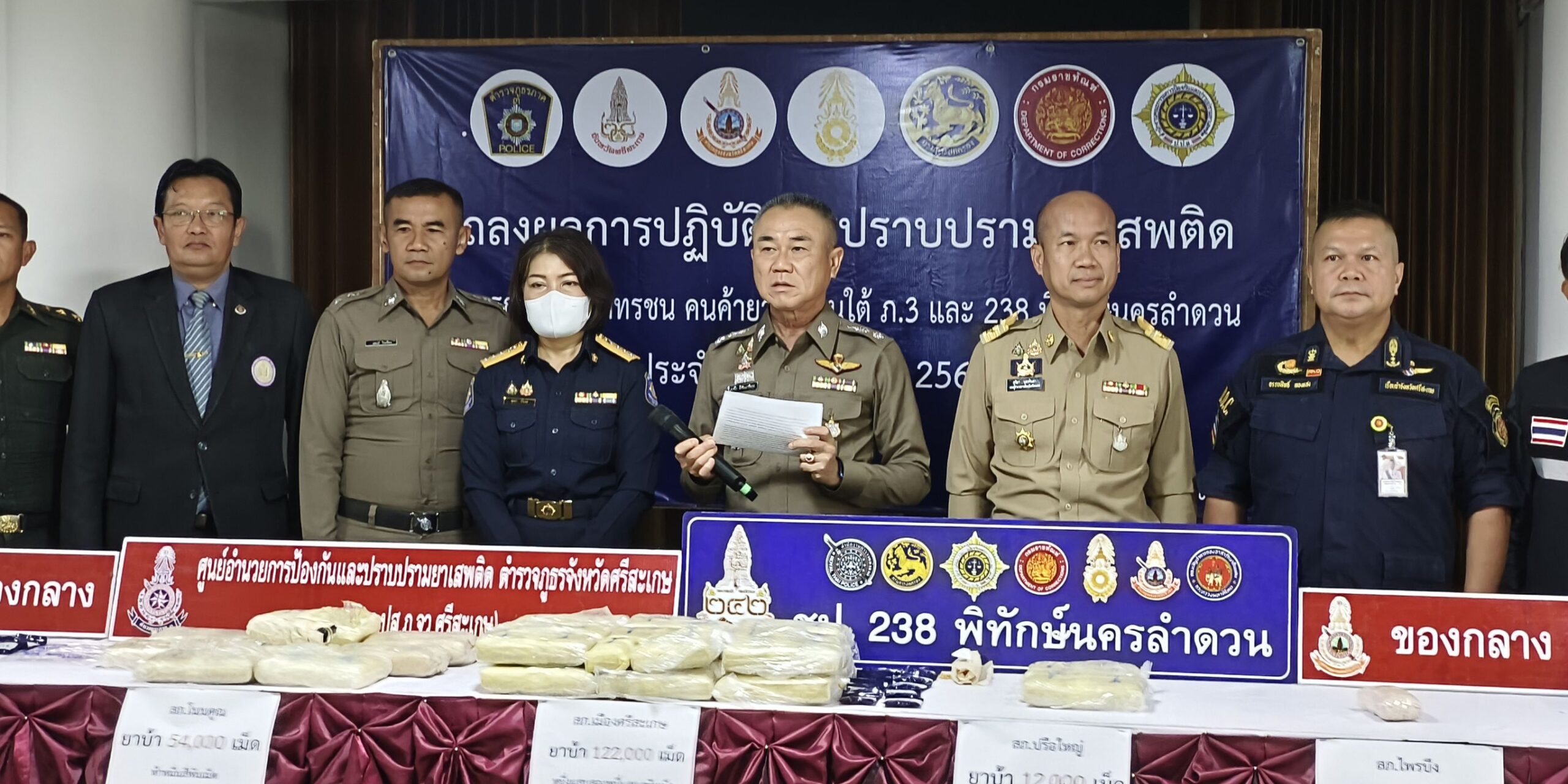 เมื่อวันที่ 15 ต.ค. 2568 ที่ห้องประชุม ชั้น 1 สำนักงานตำรวจภูธรจังหวัดศรีสะเกษ (ภ.จว.ศรีสะเกษ) นายสุริยา บุตรจินดา รอง ผวจ.ศรีสะเกษ พร้อมด้วย พล.ต.ต.ศุภชัย ศักรินพานิชกุล ผบก.ภ.จว.ศรีสะเกษ นำกำลังชุดปฏิบัติการปราบปรามยาเสพติด ภ.จว.ศรีสะเกษ ร่วมกับ ชุดปฏิบัติการ 238 พิทักษ์นครลำดวน ซึ่งประกอบด้วย ฝ่ายปกครอง ทหาร ตำรวจ ราชฑัณฑ์ ร่วมกันแถลงผลการจับกุมผู้ต้องหาคดียาเสพติด จำนวน 2 ราย พร้อมของกลางยาบ้า จำนวน 122,000 เม็ด ตรวจยึดทรัพย์สิน รถยนต์ปิกอัพ จำนวน 1 คัน รถยนต์เก๋งแท็กซี่ สีเขียวเหลือง จำนวน 1 คัน และรถ จยย. อีก 1 คัน ที่บริเวณลานจอดรถภายในปั้มน้ำมัน ปตท. สาขาบ้านเพียนาม ต.หนองไผ่ อ.เมือง จ.ศรีสะเกษ
