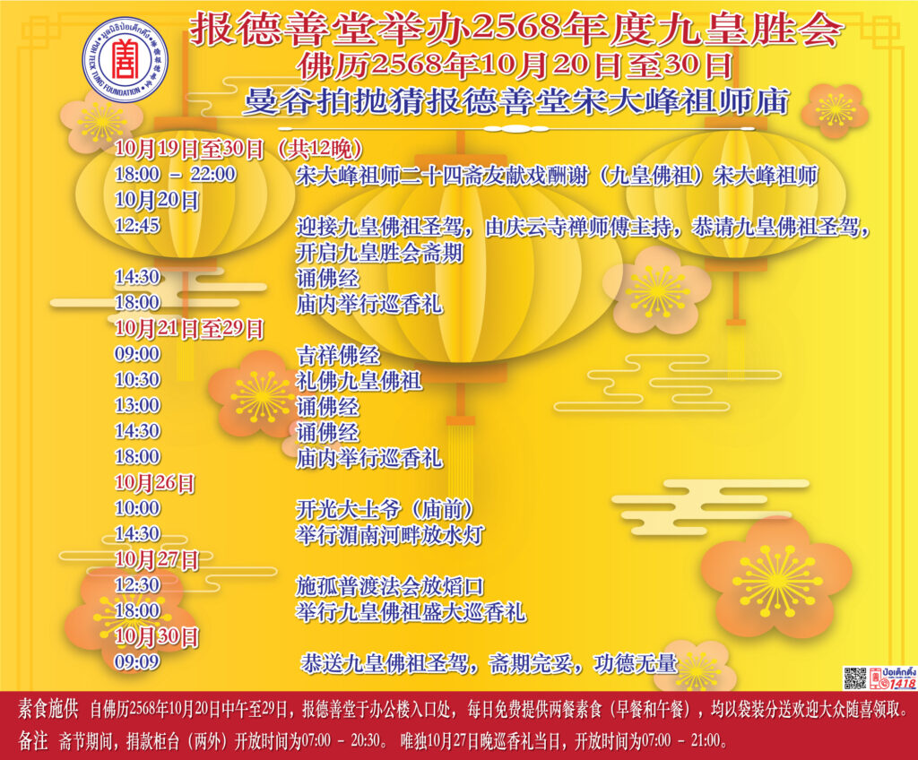 ระหว่างวันที่ 20 – 29 ตุลาคม 2568 มูลนิธิป่อเต็กตึ๊ง จัดให้มีบริการอาหารเจ [บรรจุใส่ถุง] แก่ประชาชนฟรี วันละ 2 มื้อ (มื้อเช้า และ กลางวัน) โดยเริ่มบริการตั้งแต่มื้อกลางวันของวันที่ 29 ตุลาคม ณ บริเวณทางเข้าสำนักงานมูลนิธิฯ ทั้งนี้ มูลนิธิฯ ขอความกรุณาประชาชนผู้เข้ารับบริการอาหารเจนำถุงหิ้ว/ถุงผ้ามาบรรจุอาหารด้วยทุกครั้ง