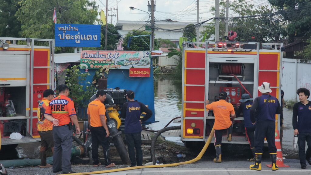 เมื่อเวลา 10.00 น. วันที่ 16 ตุลาคม 2568 ที่ ปากซอย บงกช 48 (ซอยประดู่แดง) ตำบลคลองสอง อำเภอคลองหลวง จังหวัดปทุมธานี นายยุทธศักดิ์ ชูประเสริฐ นายกเทศมนตรีเมืองคลองหลวง พร้อมด้วย นายทองสุก แสนจักร สมาชิกสภา อบจ.เขตเลือกตั้งที่ 3 อ.คลองหลวง นางสาวพรปริญญา ศรีจันทร์ สมาชิกสภา อบจ.เขตเลือกตั้งที่ 5 อ.คลองหลวง คณะผู้บริหารเทศบาลเมืองคลองหลวง เจ้าหน้าที่ป้องกันและบรรเทาสาธารณภัย ทม.คลองหลวง และ เจ้าหน้าที่เทศกิจ ทม.คลองหลวง ระดมลงพื้นที่ เพื่อบรรเทาความเดือดร้อนของประชาชน ซอย บงกช 48 หลังเกิดฝนตกและมีน้ท่วมขังในชุมชนประดู่แดงมาเป็นเวลานาน ซึ่งก่อนหน้านี้ ทาง ทม.คลองหลง ได้ติดตั้งเครืองสูบน้ำเอาไว้ที่บริเวณปากซอย แต่เนื่องจากเคืองขัดคล่อง ระดับน้ำท่วมถนนเริ่มจะเข้าบ้านเรือนประชาชน ทำให้ทาง นายยุทธศักดิ์ ชูประเสริฐ นายกเทศมนตรีเมืองคลองหลวง สังการเร่งด่วนให้ทาง เจ้าหน้าที่ป้องกันและบรรเทาสาธารณภัย ทม.คลองหลง นำรถดับเพลิง หลายคันเร่งดำเนินการสูบน้ำเพื่อบรรเทาความเดือดร้อนของประชาชน พร้อมประสาน นางสาวพรปริญญา ศรีจันทร์ สมาชิกสภา อบจ.เขตเลือกตั้งที่ 5 อ.คลองหลวง ช่วยขอเครื่องสูบน้ำจากทาง อบจ.ปทุมธานี มาตรงจุดนี้เพื่อเร่งแก้ไขปัญหา