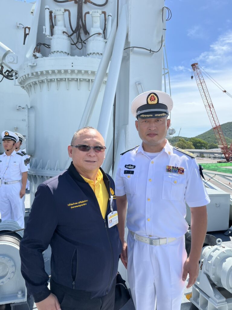 จากนั้น นาวาอากาศเอกอาวุโส สวี เจี้ยนกั๋ว ได้นำ พลเอกสวัสดิ์ ทัศนา เข้าเยี่ยมชม เรือยกพลขึ้นบกแบบบูรณาการ “อี๋เหมิงซาน” (Yi Mengshan หมายเลข 988) สังกัดกองทัพเรือปลดปล่อยประชาชนจีน (PLA Navy) ขณะที่ เรืออี๋เหมิงซาน (หมายเลข 988) เป็นเรือยกพลขึ้นบกแบบบูรณาการ Type 071 (ชื่อรหัส NATO: ชั้น Yuzhao) ซึ่งมีศักยภาพในการขนส่งกำลังพล ยานรบทหารราบ รถถังหลัก และยุทโธปกรณ์ขนาดหนัก พร้อมโรงเก็บเฮลิคอปเตอร์ที่รองรับได้ 4 ลำ และดาดฟ้าสำหรับขึ้น–ลงอีก 2 ลำ เรือยังติดตั้งปืนใหญ่ขนาด 76 มิลลิเมตร และระบบอาวุธระยะประชิดขนาด 30 มิลลิเมตร 4 ระบบ สามารถใช้ปฏิบัติภารกิจได้ทั้งทางทหารและด้านมนุษยธรรมเพื่อกระชับความร่วมมือทางการทหาร โดยเรือทั้งสองลำจะเปิดให้ประชาชนชาวไทยเข้าชมระหว่างจอดเทียบท่าเรือจุกเสม็ดการเดินทางเยือนของเรือรบจีนครั้งนี้ถือเป็นอีกก้าวสำคัญของการเสริมสร้างความสัมพันธ์ทางทหารระหว่างจีนและไทย ซึ่งจะส่งผลต่อการกระชับความร่วมมือด้านความมั่นคงในภูมิภาคเอเชียตะวันออกเฉียงใต้ในอนาคต