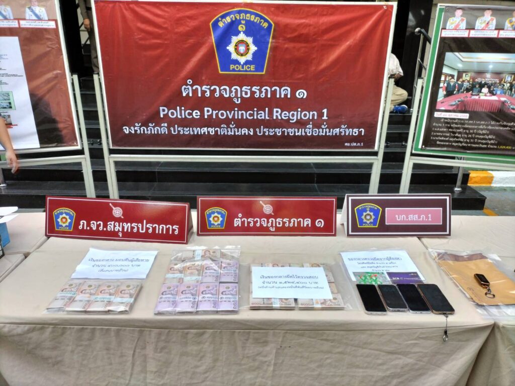 รอง ผบก.สส.ภ.1 , พ.ต.อ.วิทิต จันทร์เอี่ยม รอง ผบก.สส.ภ.1 , พ.ต.อ.ชินโชติ วัฒนธนานพ ผกก.สส.3 บก.สส.ภ.1 พร้อมเจ้าหน้าที่ตำรวจฝ่ายสืบสวน กก.สส.3 บก.สส.ภ.1 ร่วมแถลงข่าว สำนักงานตำรวจแห่งชาติทลายแก๊งกดเงินบัญชีม้าสมุทรปราการยึดเงินสดได้คามือเกือบ 2 ล้านบาท