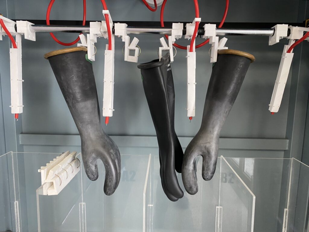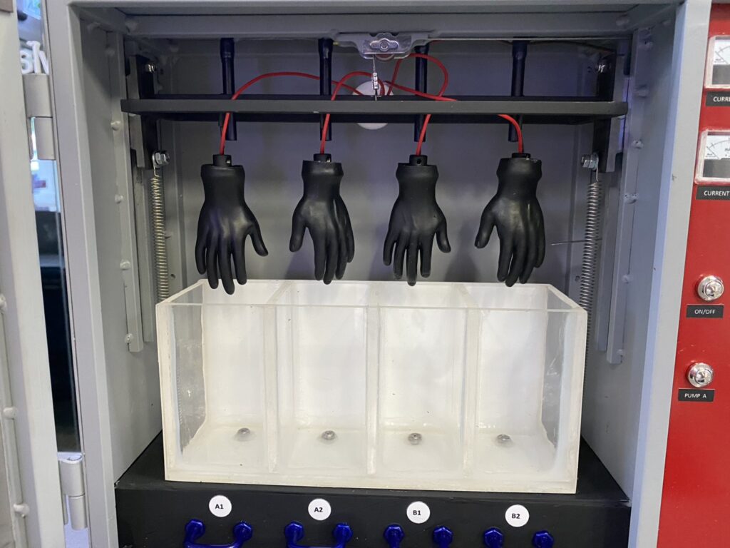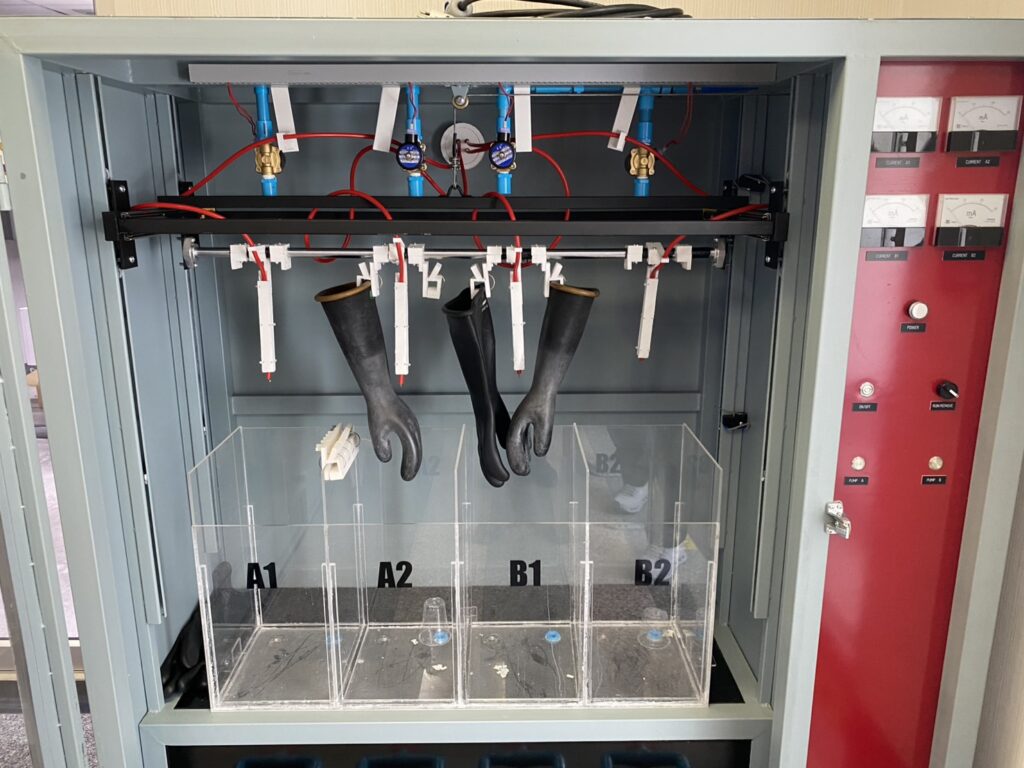 ผลงาน เครื่องทดสอบถุงมือยางไฟฟ้าแรงสูง (Insulating Gloves Tester) เป็นเครื่องทดสอบถุงมือยางไฟฟ้าแรงสูง สามารถทดสอบถุงมือยาง ได้แบบอัตโนมัติ ครอบคลุมคุณสมบัติถุงมือ ตั้งแต่ Class 00 – Class 4 โดยสามารถตรวจวัดกระแสไฟฟ้ารั่วและแสดงผลการทดสอบอย่างแม่นยำ โดยผลการทดลองและการทดสอบ ยืนยันว่าระบบสามารถตรวจจับรอยรั่วและจุดบกพร่องของถุงมือได้อย่างมีประสิทธิภาพ และมีค่าความคลาดเคลื่อนน้อย สามารถช่วยลดทั้งเวลาและค่าใช้จ่ายเมื่อเทียบกับการทดสอบจากหน่วยงานภายนอกอีกด้วย
