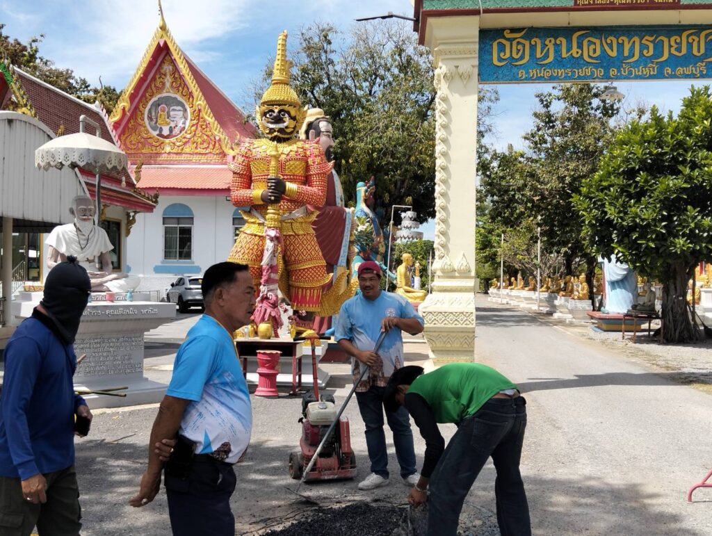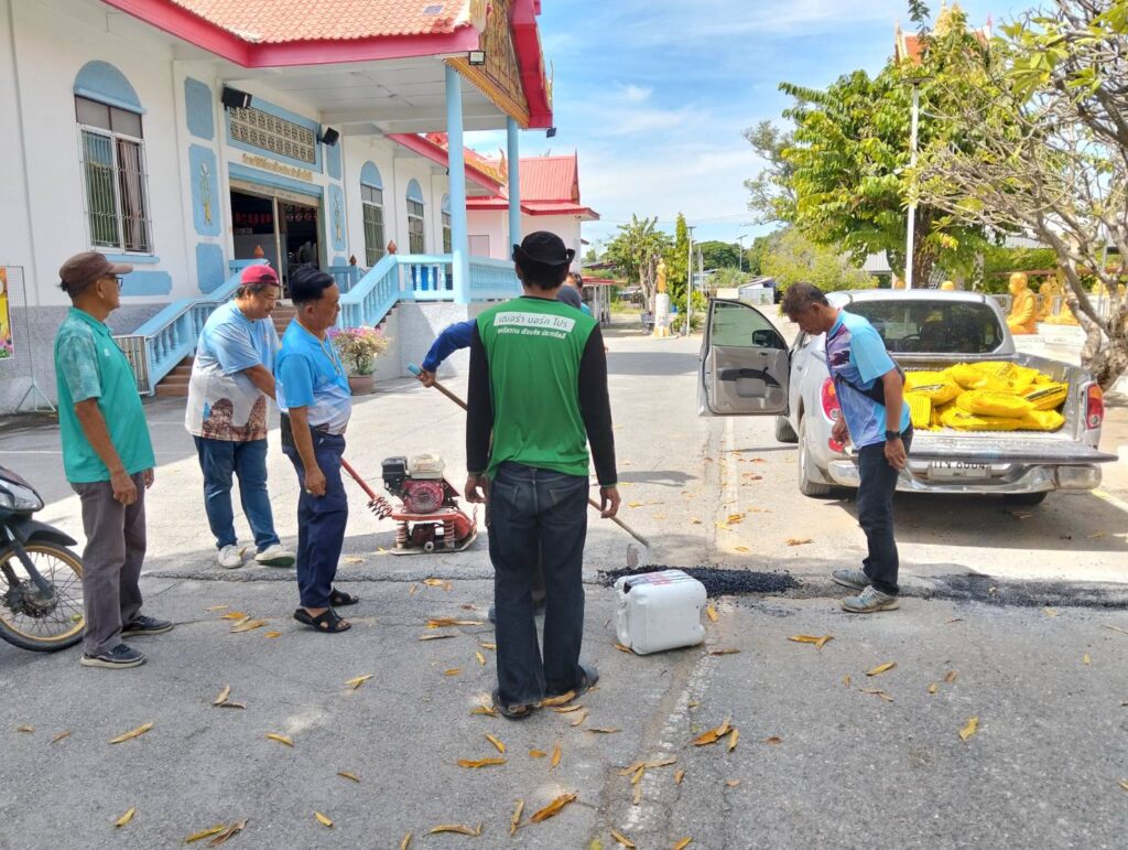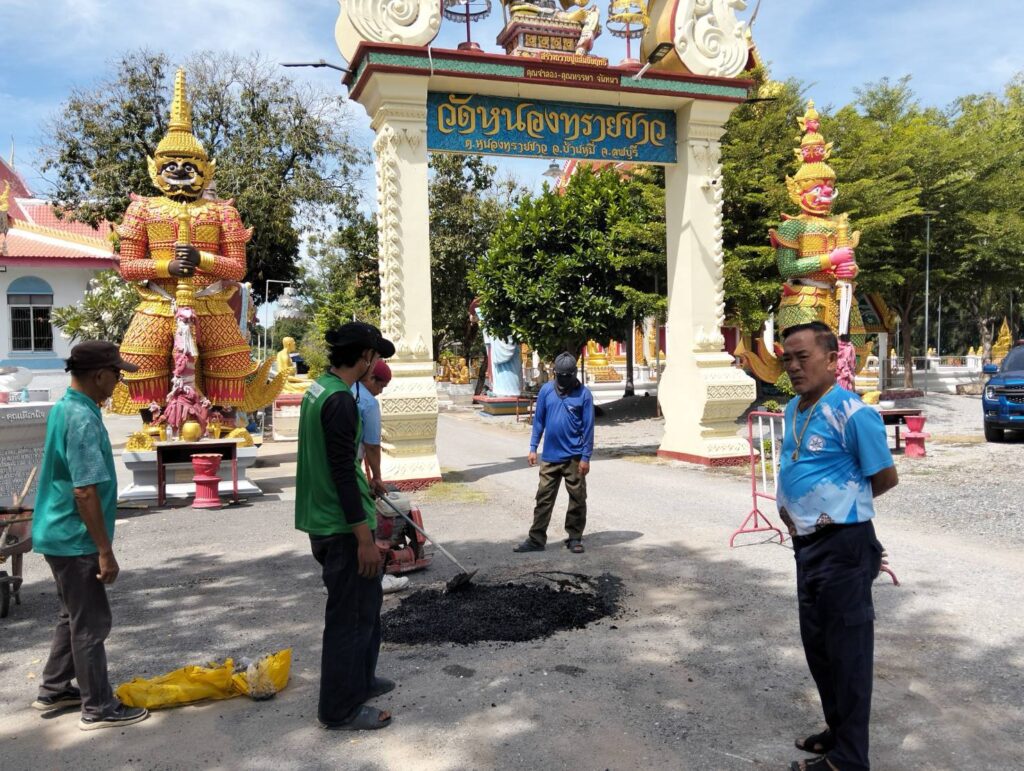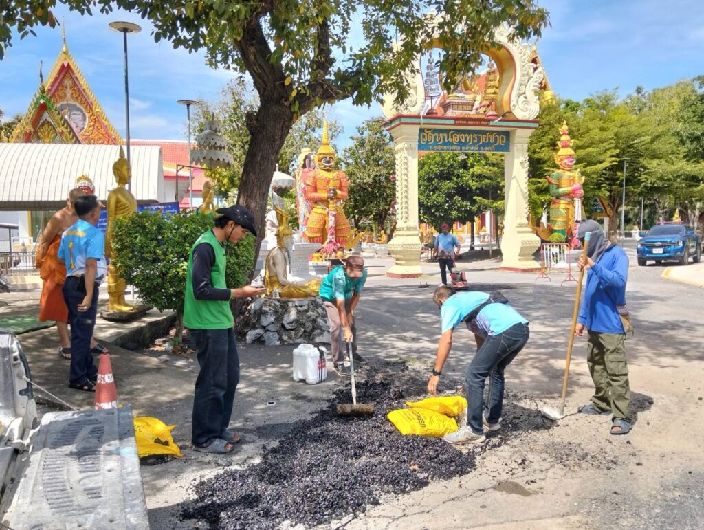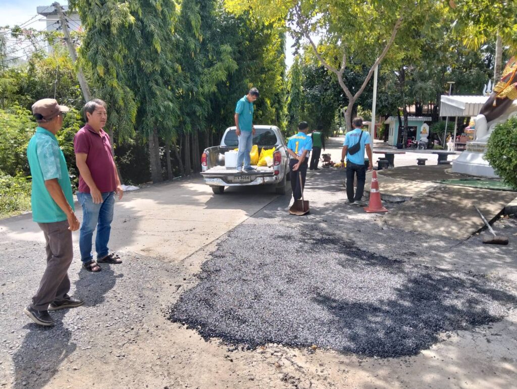 ลงพื้นที่ซ่อมแซมพื้นผิวถนนที่ชำรุด บริเวณหน้าซุ้มประตูวัดหนองทรายขาว