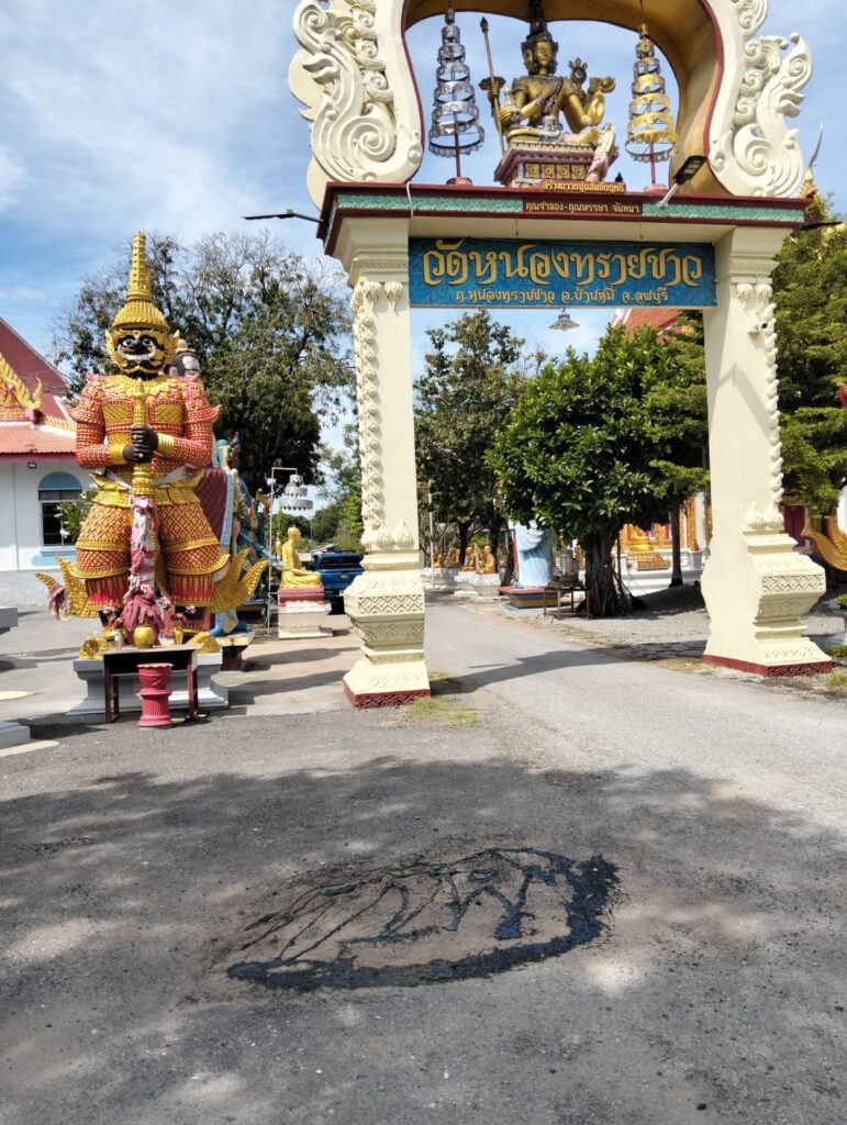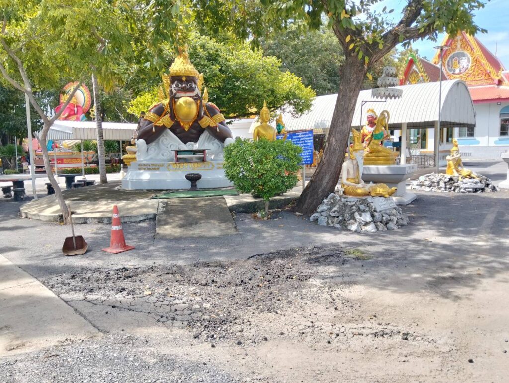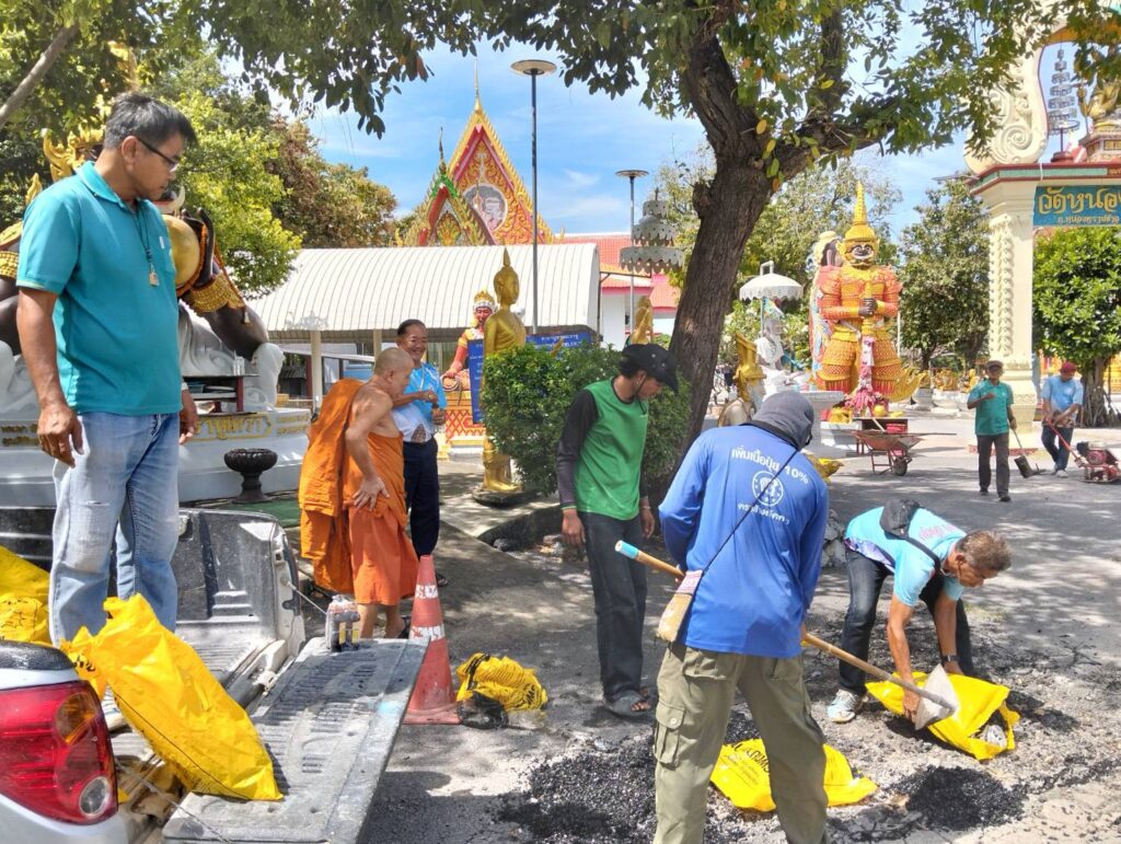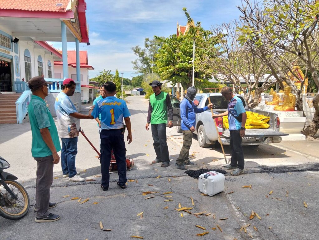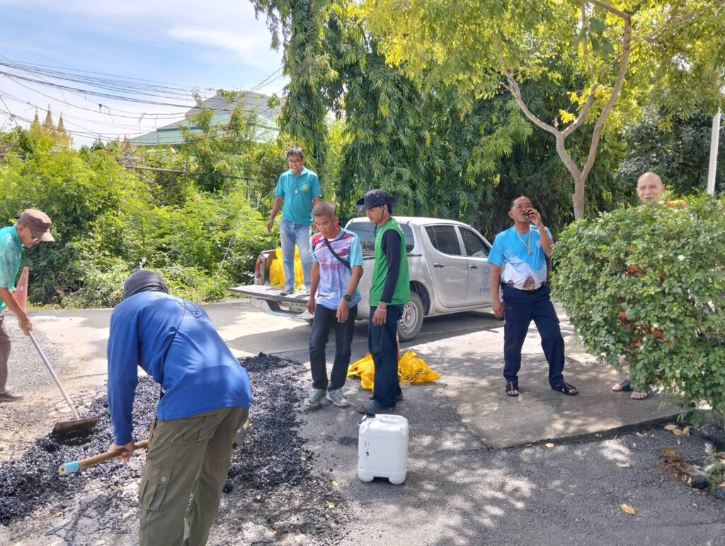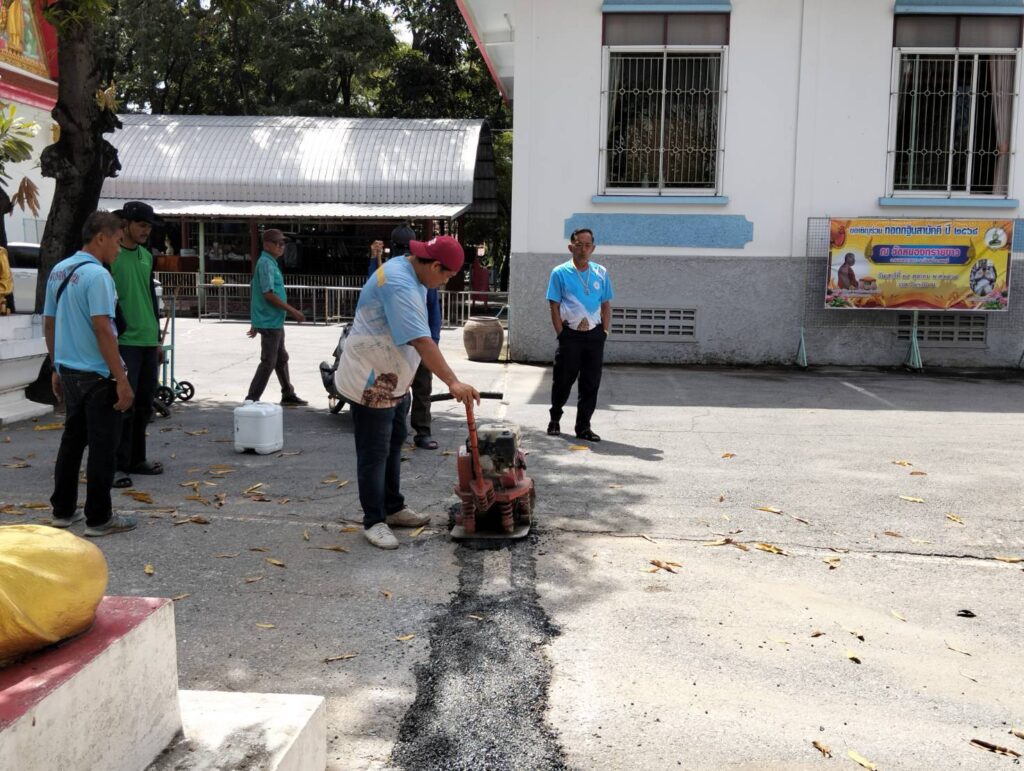 ลงพื้นที่ซ่อมแซมพื้นผิวถนนที่ชำรุด บริเวณหน้าซุ้มประตูวัดหนองทรายขาว
