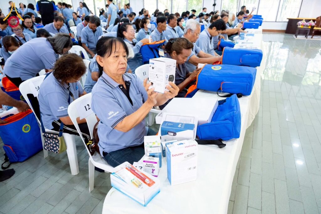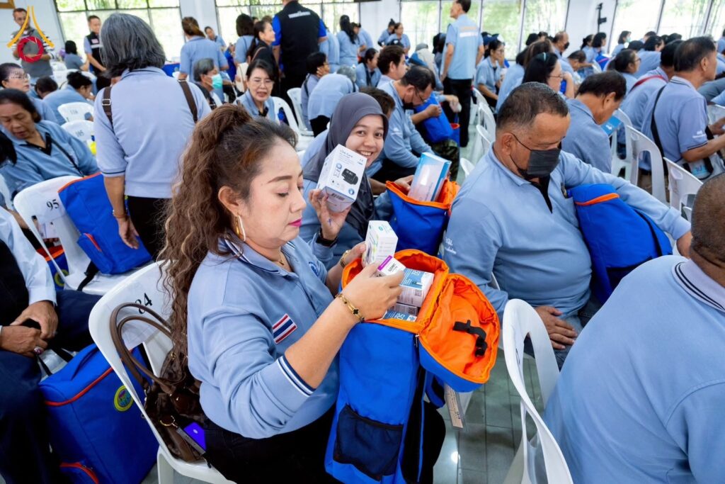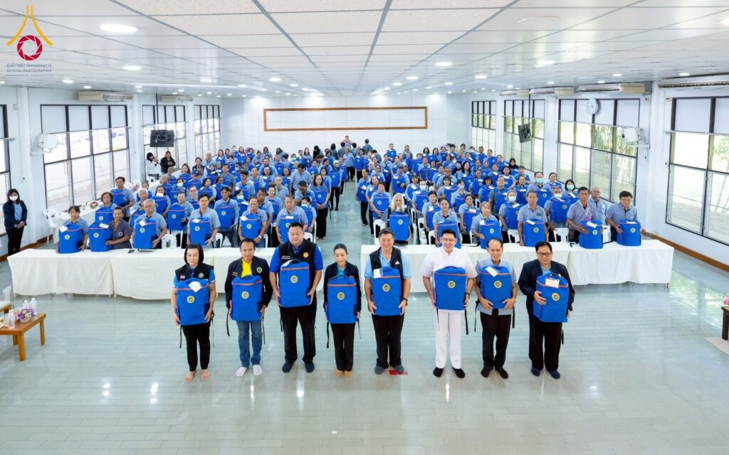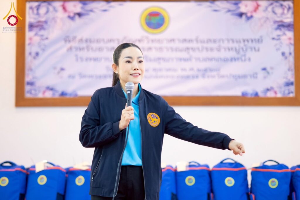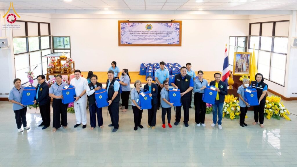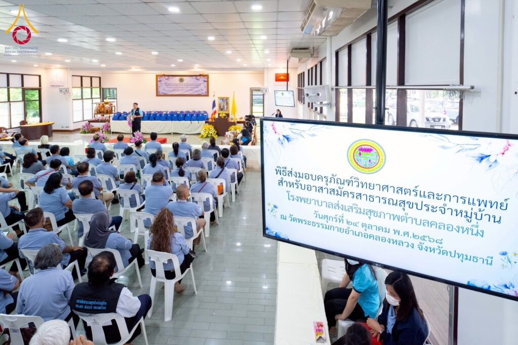 ในช่วงสุดท้ายของงาน เป็นพิธีส่งมอบครุภัณฑ์วิทยาศาสตร์และการแพทย์ “กระเป๋าชุดตรวจคัดกรองสุขภาพ” ให้กับอาสาสมัครสาธารณสุขประจำหมู่บ้าน (อสม.) โรงพยาบาลส่งเสริมสุขภาพตำบลคลองหนึ่ง อำเภอคลองหลวง สังกัดองค์การบริหารส่วนจังหวัดปทุมธานี ได้จัดสรรอุปกรณ์ดังกล่าวเพื่อให้ อสม. นำไปใช้ในการตรวจคัดกรองสุขภาพประชาชนในพื้นที่ สนับสนุนให้การดูแลสุขภาพเชิงรุกเข้าถึงทุกครัวเรือน พิธีมอบครุภัณฑ์ครั้งนี้ได้รับเกียรติจากผู้แทนหน่วยงานหลายภาคส่วนเข้าร่วมประกอบด้วย ร้อยเอก นายแพทย์ พงษ์ศักดิ์ เจริญงามเสมอ ที่ปรึกษาพิเศษนายกองค์การบริหารส่วนจังหวัดปทุมธานี นางสาวอภิสรา เกษอินทร์ นายอำเภอคลองหลวง นายยุทธศักดิ์ ชูประเสริฐ นายกเทศมนตรีเมืองคลองหลวง นายสัญชาติ คุระนันท์ สมาชิกสภาองค์การบริหารส่วนจังหวัดปทุมธานี นางลลิดา เสนกรรหา รักษาราชการแทนสาธารณสุขอำเภอคลองหลวง นายสุริยนต์ โคตรชมภู ผู้อำนวยการโรงพยาบาลส่งเสริมสุขภาพตำบลคลองหนึ่ง และนายองอาจ ณฐ ธรรมนิทา ผู้แทนคณะศิษยานุศิษย์วัดพระธรรมกาย กรรมการฝ่ายสาธารณสงเคราะห์ของวัดพระธรรมกาย