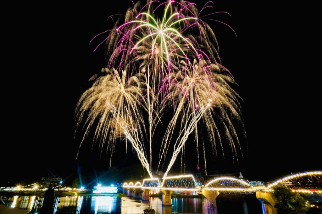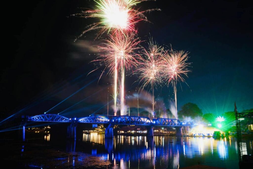 การจัดพลุและดอกไม้ไฟ การจัดแสดง แสง เสียง กำหนดภายใต้แนวคิด “แสงแห่งพระมหากรุณาธิคุณ ส่องสว่างเหนือลำน้ำแคว” ซึ่งจัดทั้งหมด 11 รอบการแสดง เพิ่มกิจกรรมยืนสงบนิ่ง 1 นาที ร่วมน้อมถวายความอาลัย สมเด็จพระนางเจ้าสิริกิติ์ พระบรมราชินีนาถ พระบรมราชนนีพันปีหลวง ก่อนเริ่มพิธีเปิดฯ ปรับการจุดพลุ ให้เป็นการจุดพลุเฉลิมพระเกียรติและเทคนิคอื่นๆ โดยใช้สีเหลือง ทอง ขาว งดสีสัน