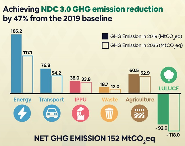นายสุชาติ ชมกลิ่น รองนายกรัฐมนตรีและรัฐมนตรีว่าการกระทรวงทรัพยากรธรรมชาติและสิ่งแวดล้อม (รมว.ทส.) เปิดเผยว่า คณะรัฐมนตรี (ครม.) เมื่อวันที่ 4 พฤศจิกายน 2568 มีมติเห็นชอบต่อร่างเป้าหมายการมีส่วนร่วมที่ประเทศกำหนด ฉบับที่ 2 (NDC 3.0) ซึ่งเป็นก้าวสำคัญในการเร่งเป้าหมาย Net Zero ให้เร็วขึ้น 15 ปี เพื่อให้สอดคล้องกับ 1.5 ºC Pathway ตามนโยบายของรัฐบาลข้อ 13 การผลักดันสังคมคาร์บอนต่ำ ที่นายกรัฐมนตรีอนุทิน ชาญวีรกูล แถลงต่อรัฐสภา โดยมุ่งลดการปล่อยก๊าซเรือนกระจกในทุกภาคส่วนของเศรษฐกิจ (Economy-wide) ณ ปี ค.ศ.2035 (พ.ศ.2578) และเร่งเพิ่มเป้าหมายการดูดกลับก๊าซเรือนกระจกในภาคป่าไม้และการใช้ประโยชน์ที่ดิน (LULUCF) ซึ่งจะทำให้ประเทศไทยมีระดับการปล่อยก๊าซเรือนกระจกสุทธิ 152 MtCO2eq หรือลดลงร้อยละ 47 จากระดับการปล่อยก๊าซเรือนกระจกในปี ค.ศ.2019 รวมถึงได้จัดทำแผนการลงทุนเพื่อดึงเม็ดเงินจากต่างประเทศ 230,000 ล้านบาท ในการสนับสนุนไทยลดก๊าซเรือนกระจก 32.8 MtCO2eq ตามเงื่อนไขของความตกลงปารีส