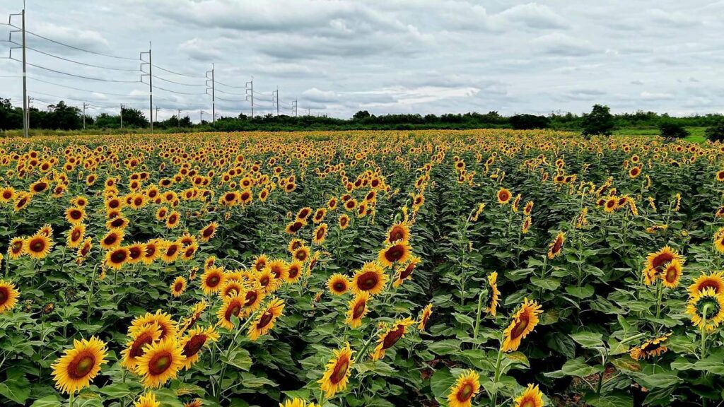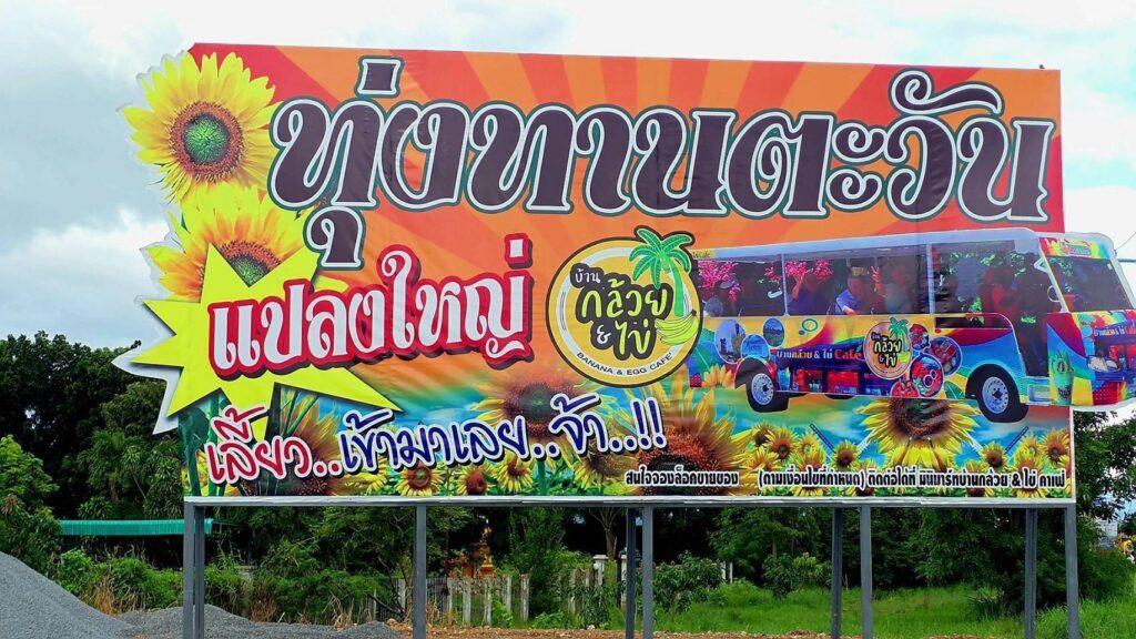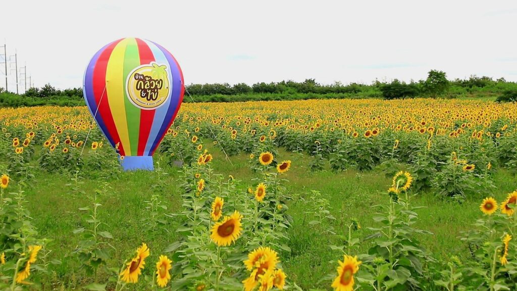 ซึ่งทุ่งทานตะวัน … บ้านกล้วยและไข่ เป็นลักษณะทุ่งทานตะวันแปลงใหญ่ ผสมผสานกับแหล่งท่องเที่ยวเชิงเกษตร ของอำเภอพัฒนานิคม จังหวัดลพบุรี โดยในทุ่งทานตะวันแห่งนี้ จะมีแปลงปลูก ซึ่งมีการบริหารจัดการเป็นอย่างดี จัดสรรพื้นที่ โดยสลับหมุนเวียนกันปลูกเป็น 6 แปลงใหญ่ ให้มีการออกดอกเบ่งบานต่อเนื่องทดแทนกันได้ตลอดฤดูกาล ร่วมกับไม้ดอกไม้ประดับชนิดอื่นๆ โดยเฉพาะ Yellow Cosmos หรือ ดอกคอสมอสสีเหลือง พร้อมกับมีมุมถ่ายรูปที่หลากหลายไว้คอยต้อนรับนักท่องเที่ยว อีกทั้งยังมีการจัดรถกอล์ฟ และรถยนต์ชมทุ่งขนาดใหญ่ ไว้ค่อยให้บริการรับส่งนักท่องเที่ยวสำหรับเข้าชมทุ่งทานตะวันและสวนดอกไม้ด้วย ซึ่งปกติแล้ว เกษตรกร ผู้ปลูกทานตะวัน ส่วนใหญ่ จะเลือกฤดูกาลเพาะปลูกทานตะวัน ให้เบ่งบานในช่วงปลายฝนต้นหนาว เนื่องจากทานตะวันเป็นพืชที่ทนต่อความแห้งแล้ง และอากาศเย็นได้ดี หันหน้าสู้แดดอยู่ตลอดเวลา