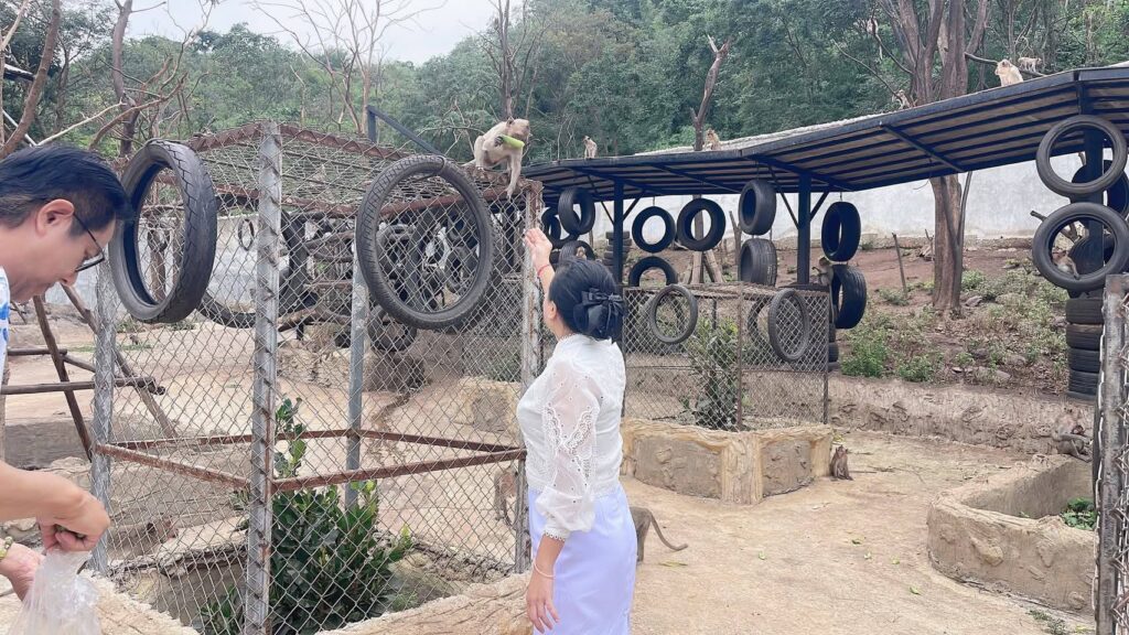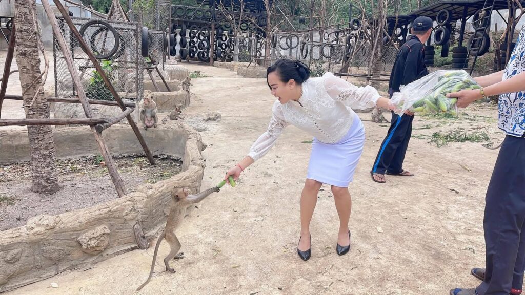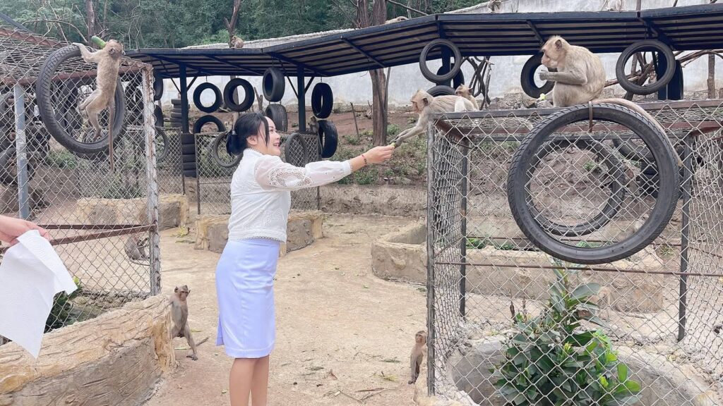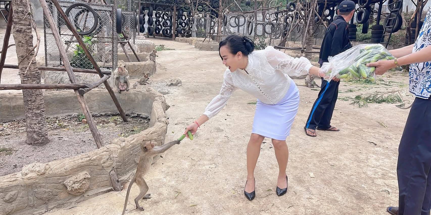 นำผลไม้มาเลี้ยงลิงและนำอาหารมาเลี้ยงสุนัขและแมว
