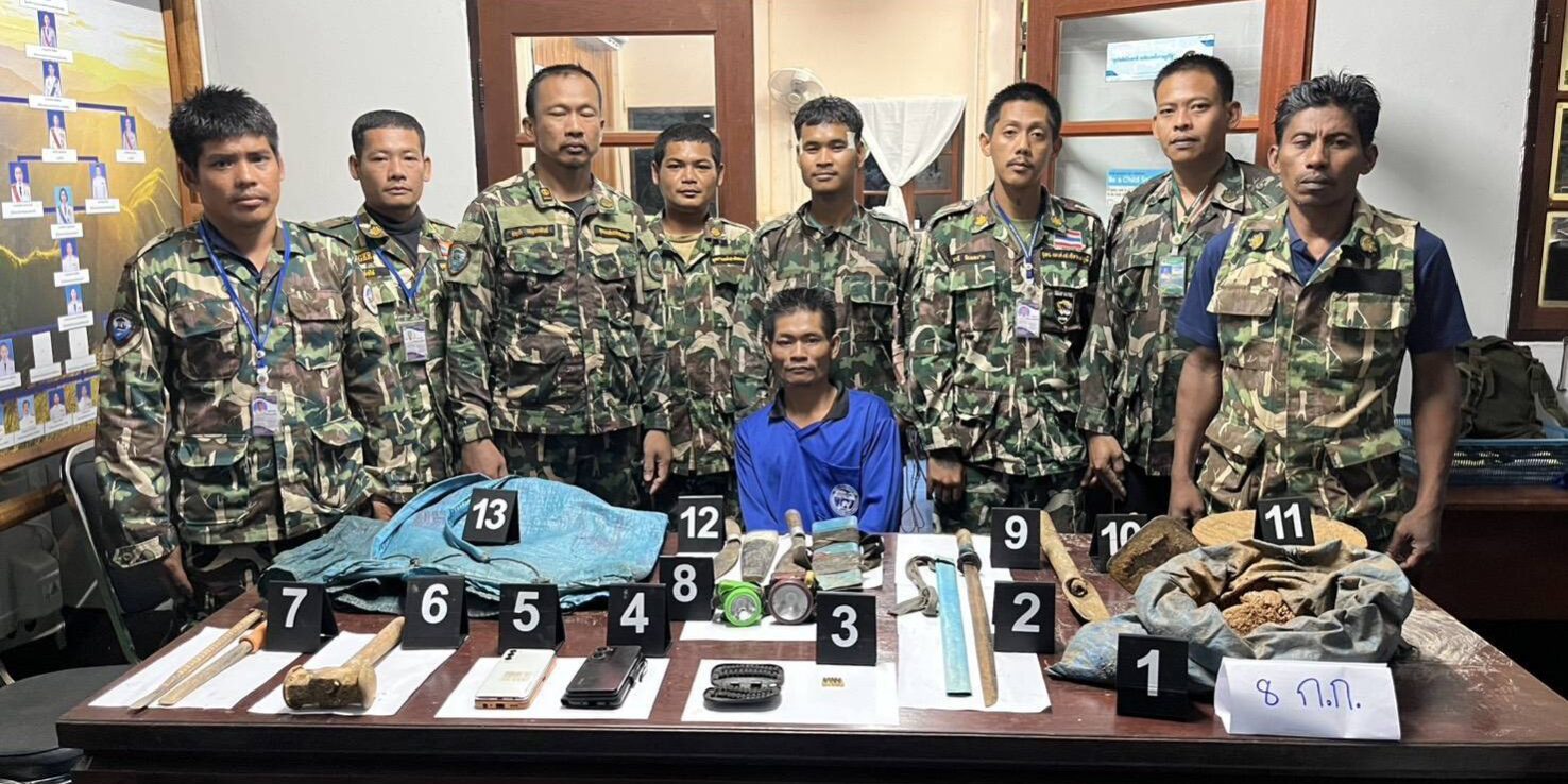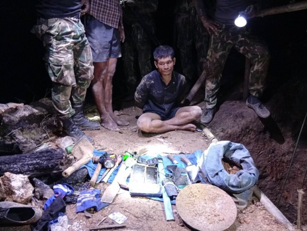 ผลการจับกุมพบ นายโซเอะเกดุ (ไม่มีนามสกุล) อายุ 34 ปี สัญชาติพม่า จากหมู่บ้านยาพู ประเทศเมียนมา แอบหลบอยู่ในหลุมขุดดิน พร้อมยึดของกลาง 13 รายการ ได้แก่ กระสอบดิน 8 กิโลกรัม,มีดดาบ,กระสุนปืน .22 LR จำนวน 5 นัด,โทรศัพท์มือถือ 2 เครื่อง,อุปกรณ์ขุดดินและร่อนแร่ รวมมูลค่าความเสียหาย 756,307 บาท ทั้งนี้ ผู้ต้องหาให้การว่าเดินทางเข้าเมืองไทยผ่านช่องทางธรรมชาติช่องป่าหมาก-ยาพู พร้อมเพื่อนอีก 3 คน โดยถูกชักชวนให้มาขุดดินหาแร่ทองคำ
