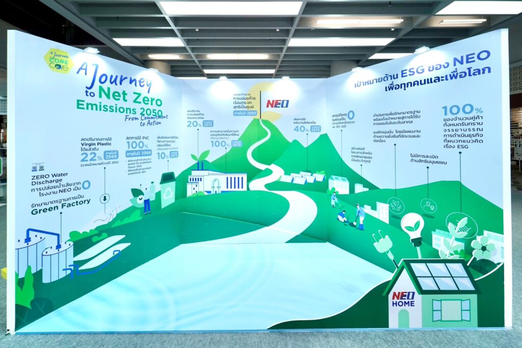 - A Journey to Net Zero Emissions: ตอกย้ำคำมั่นสัญญาและเป้าหมายที่ชัดเจนของ NEO ในการมุ่งสู่การปล่อยก๊าซเรือนกระจกสุทธิเป็นศูนย์ ภายในปี พ.ศ. 2593 (Net Zero Pathway) โชว์ความคืบหน้าสำคัญ เช่น การปล่อยน้ำเสียจากโรงงานเป็นศูนย์ (ZERO Water Discharge), การลดใช้ PVC ให้ได้ 100% ภายในปี 2568, และความสำเร็จในการลดการใช้ Virgin Plastic ได้แล้วถึง 22% ซึ่งเร็วกว่าเป้าหมายที่วางไว้