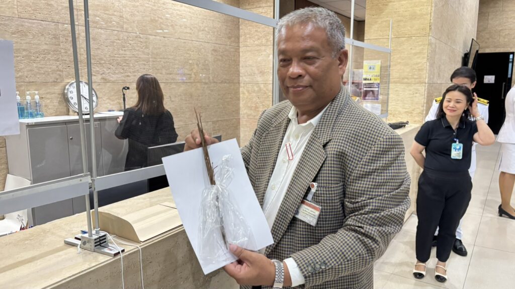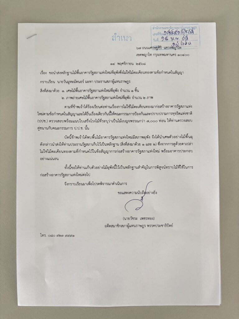 บัดนี้ข้าพเจ้าได้พบพื้นไม้อาคารรัฐสภาแห่งใหม่มีสภาพผุพัง จึงได้นำเศษตัวอย่างไม้พื้นผุดังกล่าวนำส่งให้ท่านประธานรัฐสภาเก็บไว้เป็นหลักฐาน ซึ่งจากการดูด้วยตาเปล่าไม่ใช่ไม้ตะเคียนทองตามที่กำหนดไว้ในข้อสัญญาการก่อสร้างอาคารรัฐสภาแห่งใหม่ พร้อมอาคารประกอบ อย่างแน่นอน