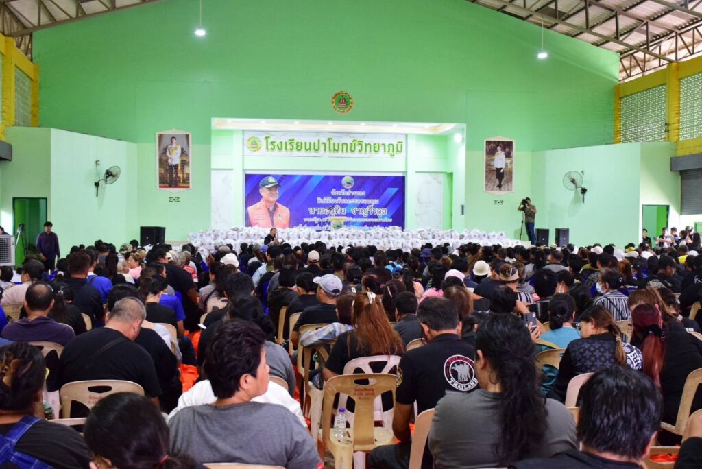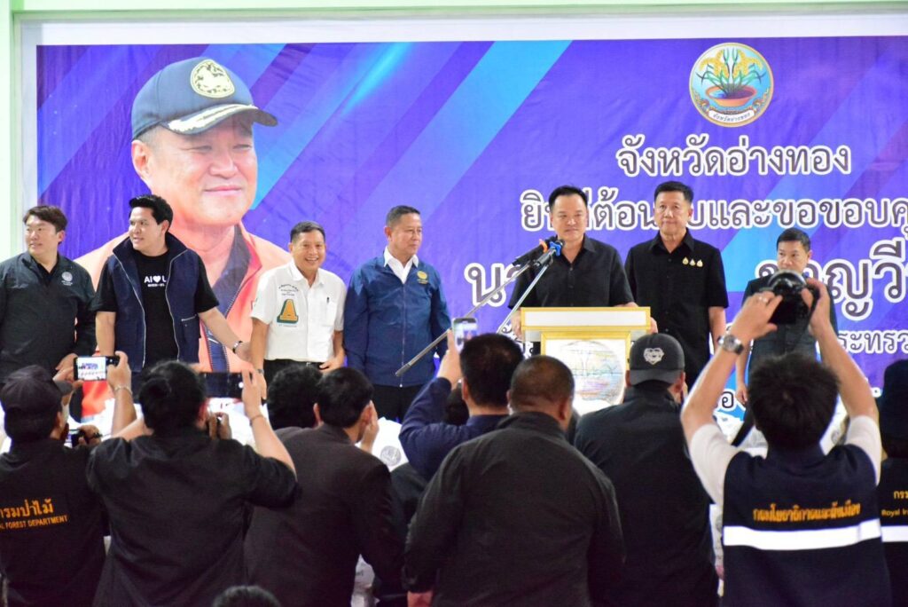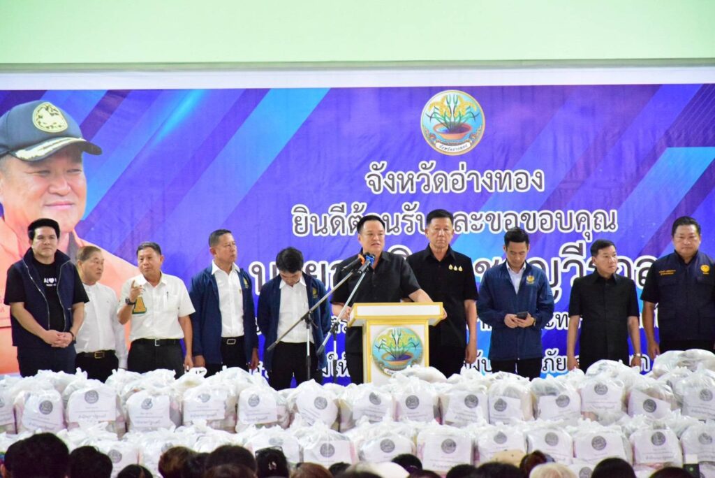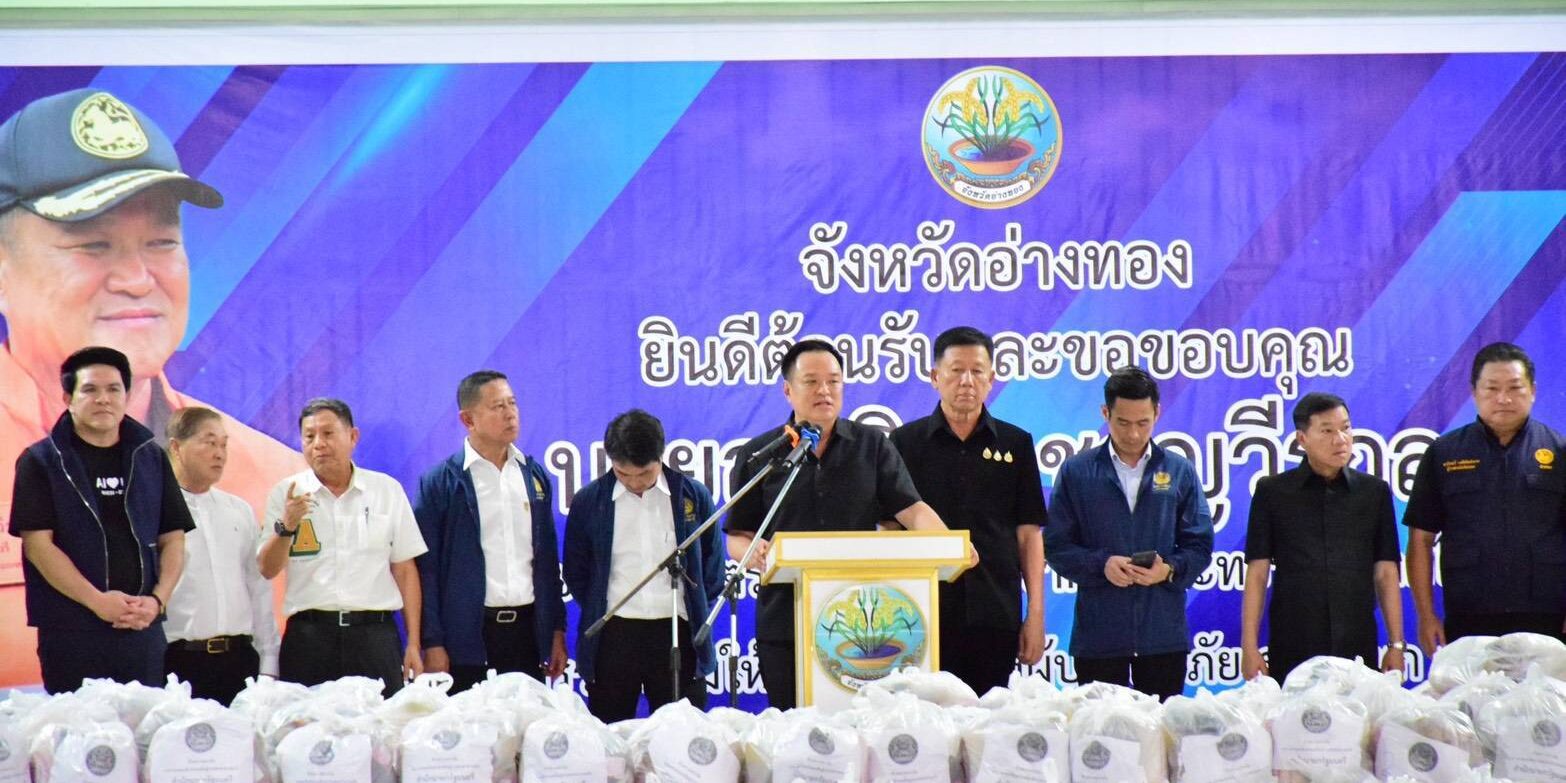 นายอนุทิน ชาญวีรกูล นายกรัฐมนตรีและรัฐมนตรีกระทรวงมหาดไทย พร้อมคณะเดินทางมาตรวจราชการจังหวัดอ่างทอง และมอบถุงยังชีพช่วยเหลือผู้ประสบอุทกภัยในพื้นที่ จำนวน 1,500 ชุด