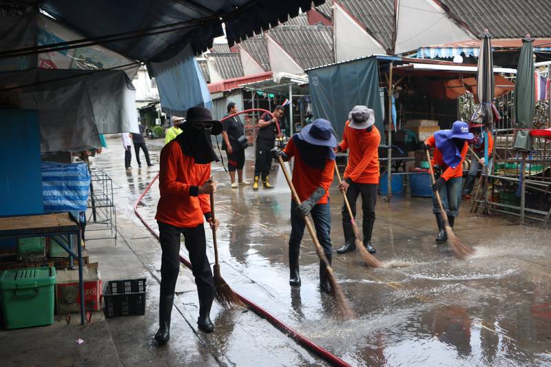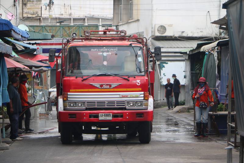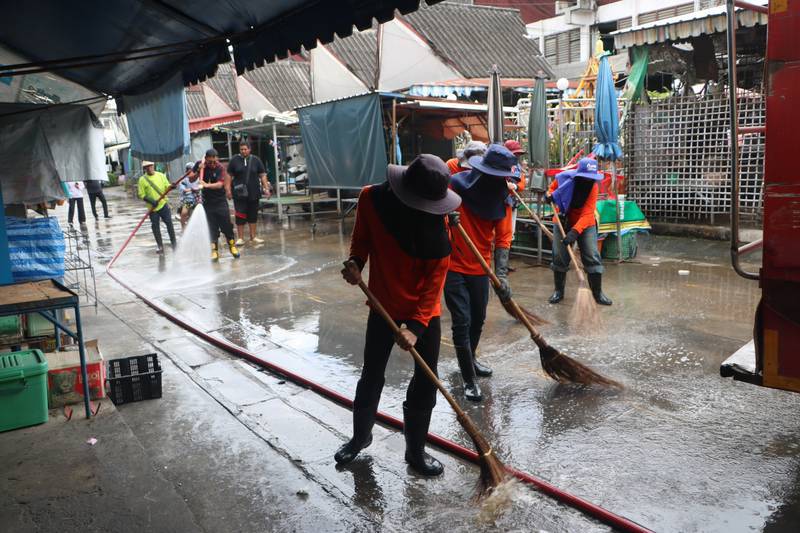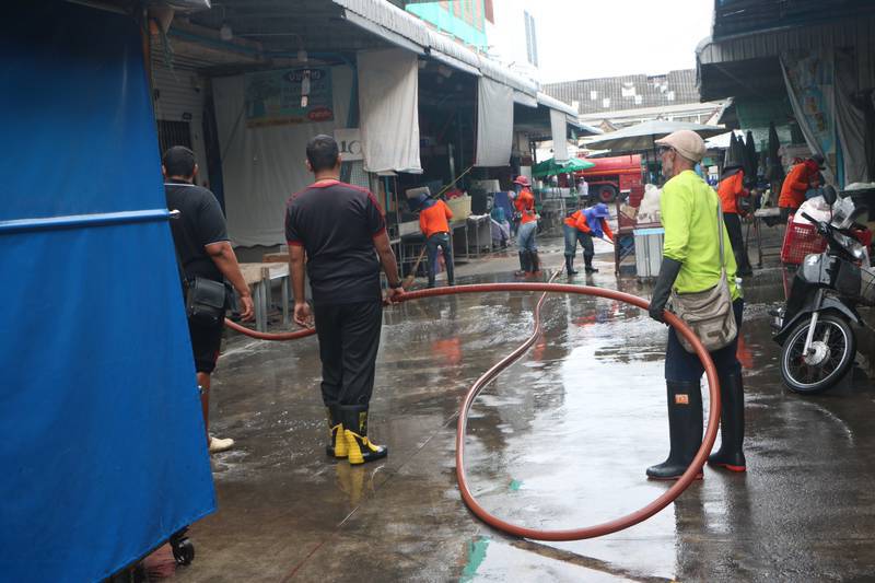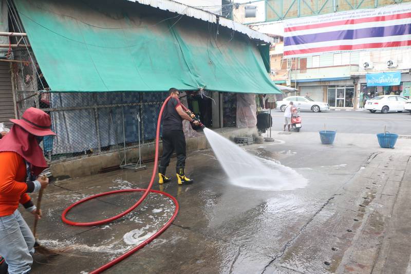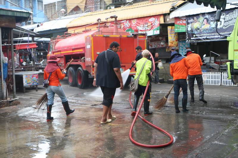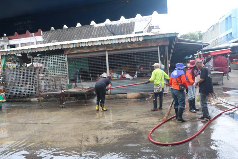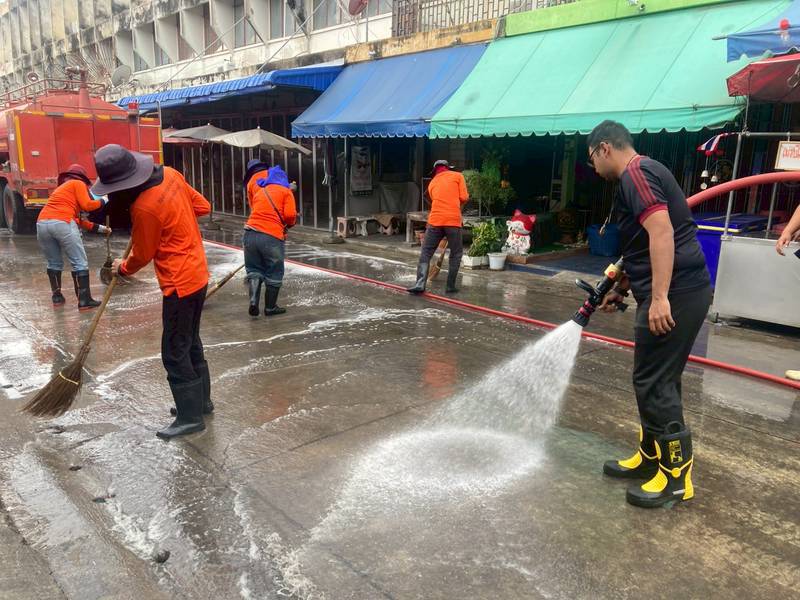 นำอุปกรณ์ทำความสะอาด พร้อมด้วยรถดับเพลิง ออกปฏิบัติงานล้างถนนโดยรอบตลาดสดเทศบาลฯ