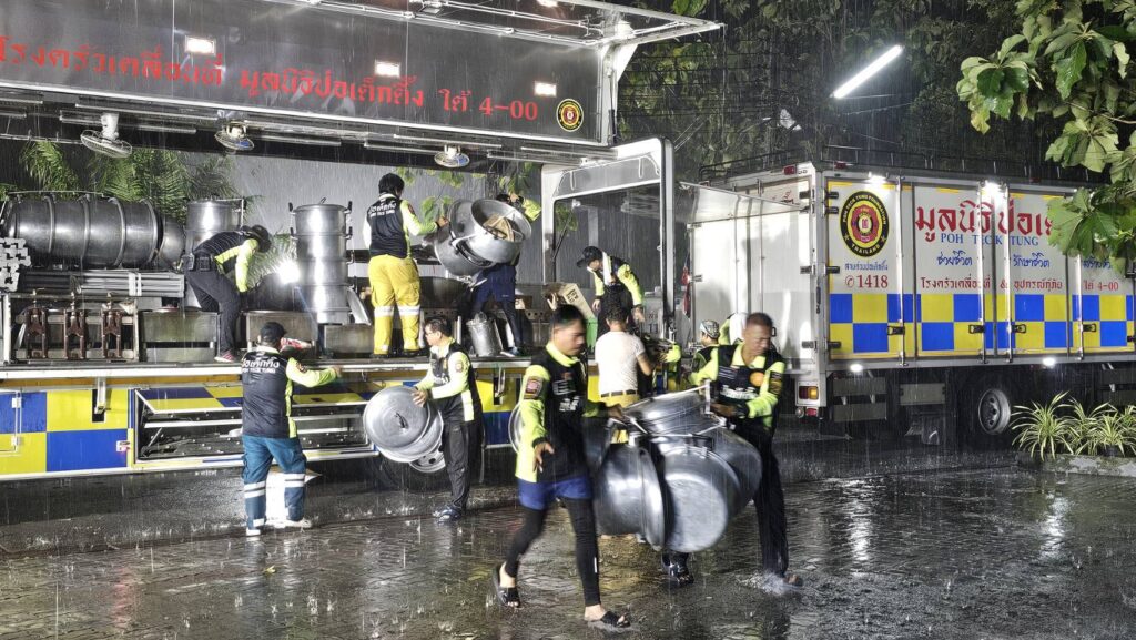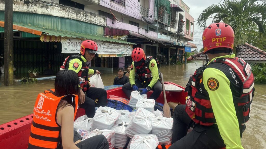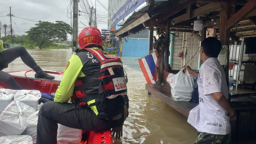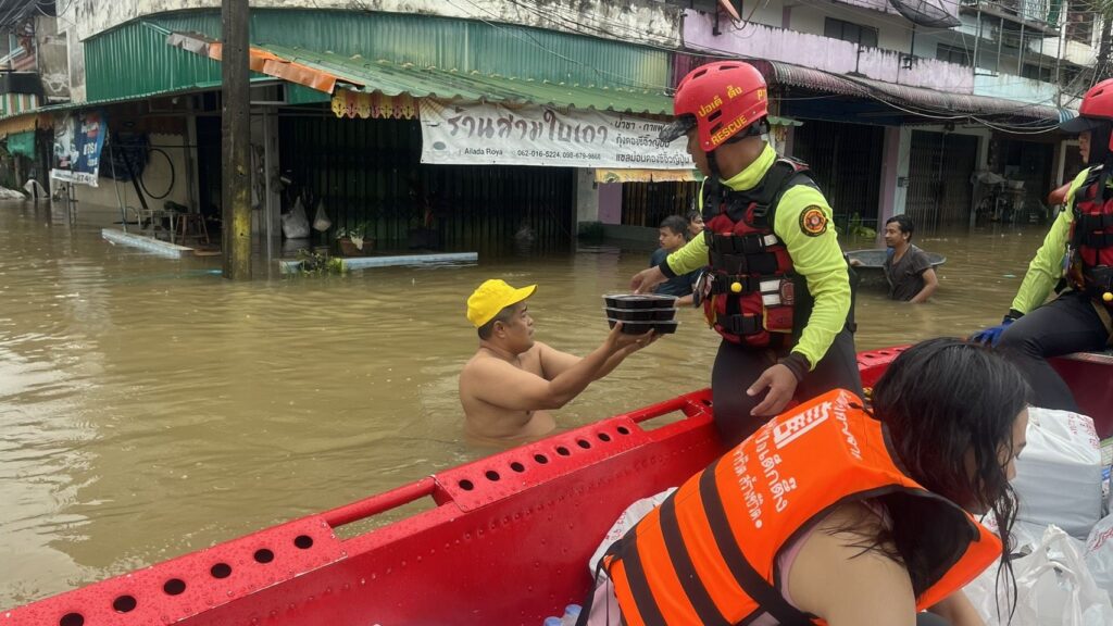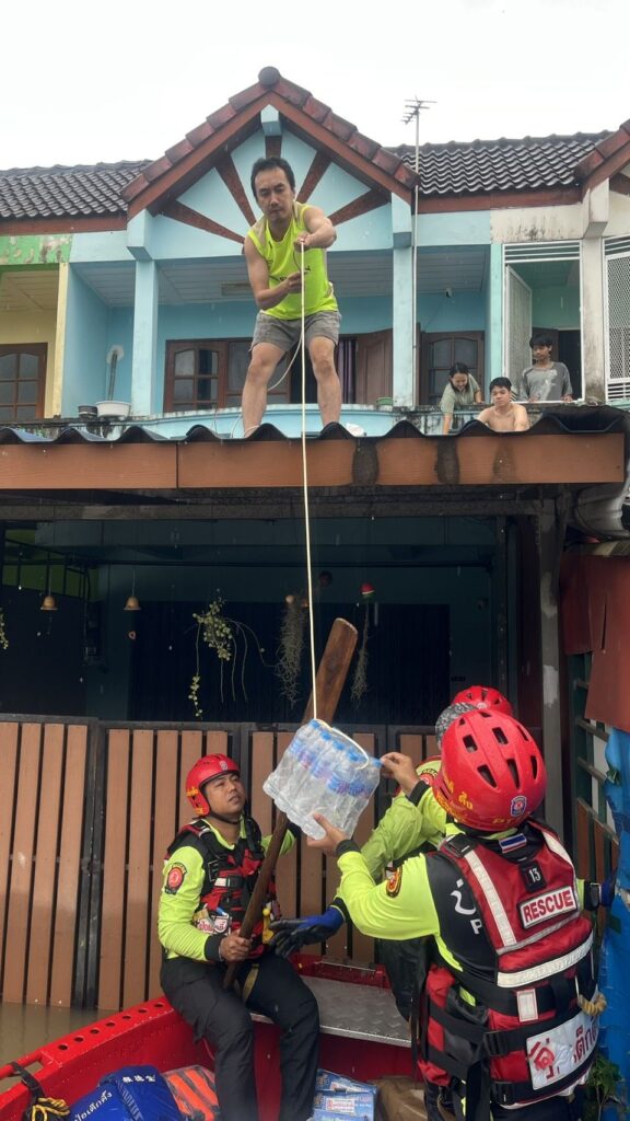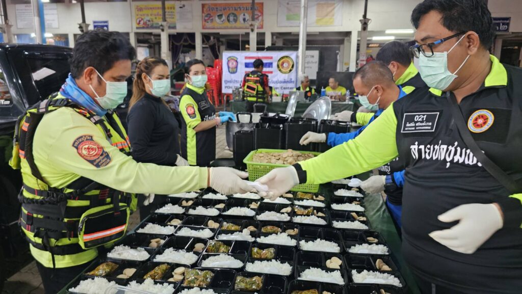 ประกอบอาหารปรุงสุกแจกจ่ายอาหารกล่องพร้อมน้ำดื่ม เสื้อชูชีพ ยาสามัญประจำบ้าน และอาหารสุนัขและแมวต่อเนื่อง