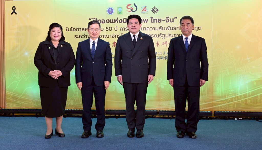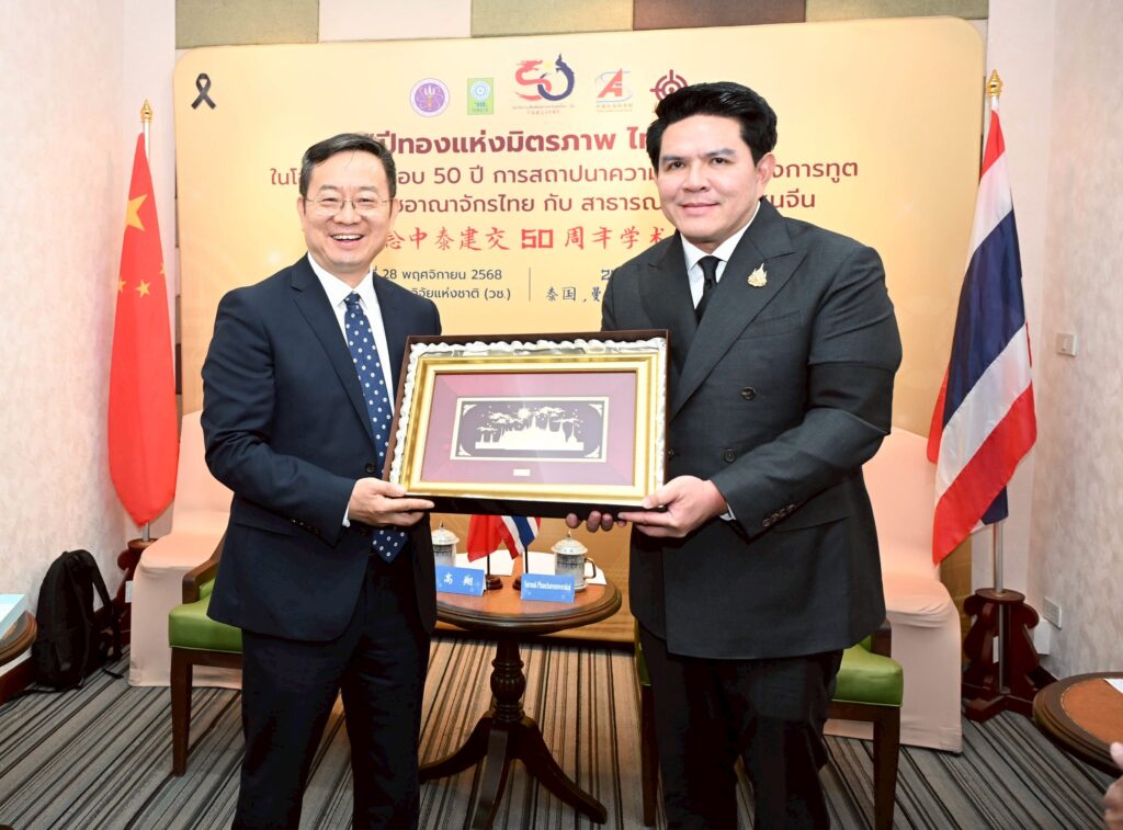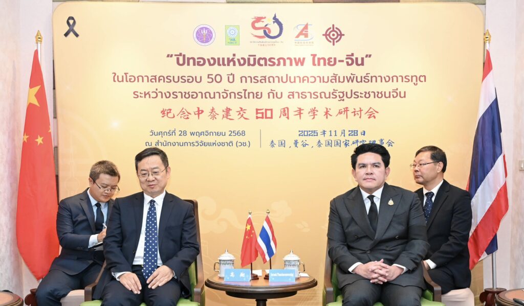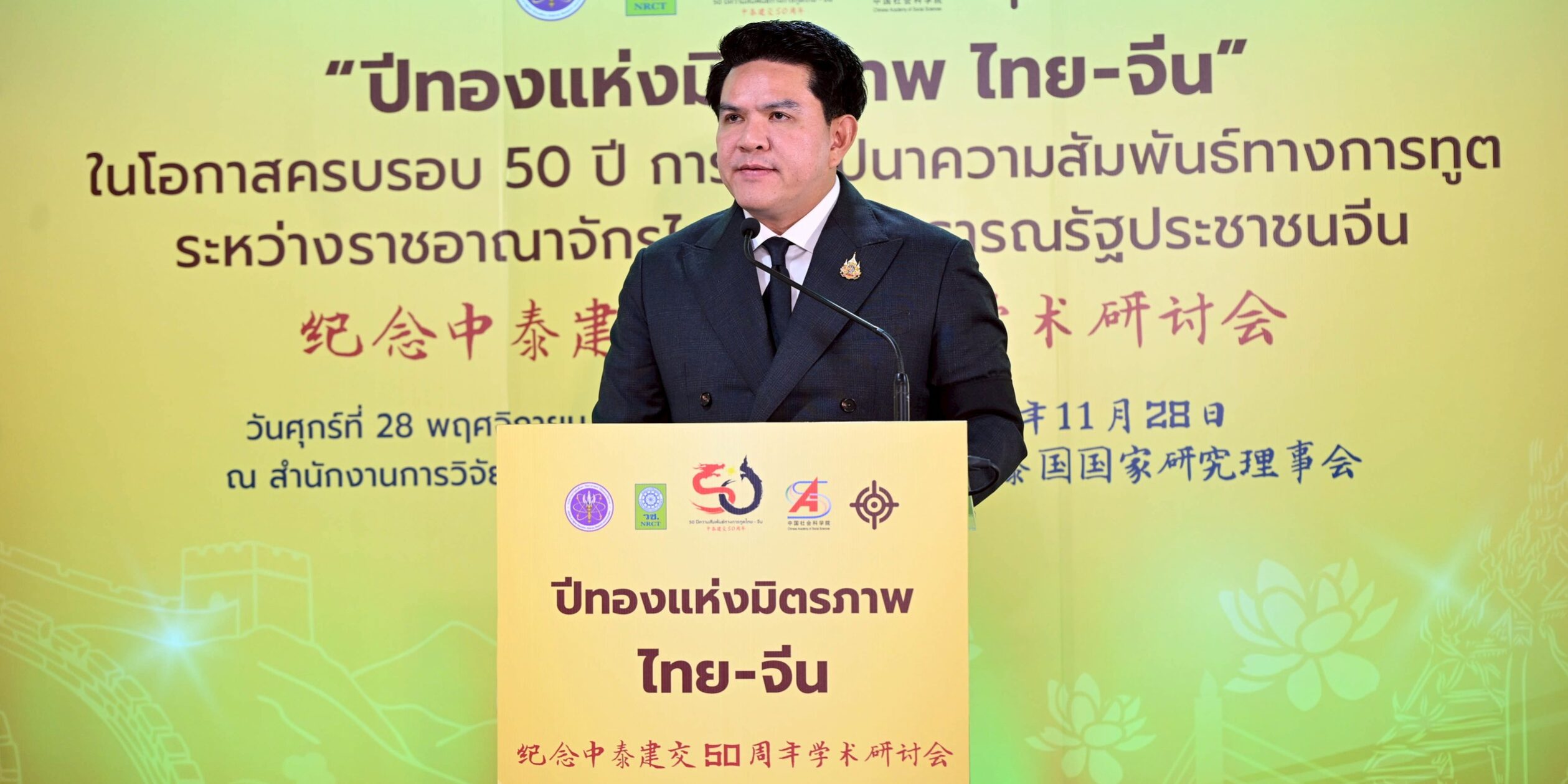เมื่อวันที่ 28 พ.ย.2568 : นายสุรศักดิ์ พันธ์เจริญวรกุล รัฐมนตรีว่าการกระทรวงการอุดมศึกษา วิทยาศาสตร์ วิจัยและนวัตกรรม (อว.) เป็นประธานเปิดงาน “ปีทองแห่งมิตรภาพ ไทย–จีน” เนื่องในโอกาสครบรอบ 50 ปี การสถาปนาความสัมพันธ์ทางการทูตระหว่างประเทศไทยและสาธารณรัฐประชาชนจีน พร้อมกล่าวปาฐกถาพิเศษในหัวข้อ “ไทย–จีน สานพลังขับเคลื่อนอนาคตด้วยวิทยาศาสตร์ วิจัย และนวัตกรรม” โดยมี ศ.เกา เสียง ประธานสถาบันสังคมศาสตร์จีน (CASS) เป็นประธานร่วมเปิดงาน และมี ดร. วิภารัตน์ ดีอ่อง ผู้อำนวยการสำนักงานการวิจัยแห่งชาติ คณะผู้บริหารสำนักงานการวิจัยแห่งชาติ ข้าราชการ และเจ้าหน้าที่ เข้าร่วม ณ สำนักงานการวิจัยแห่งชาติ