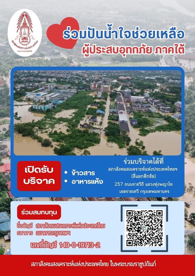สภาสังคมสงเคราะห์แห่งประเทศไทยฯ ขอเชิญทุกท่านร่วมเป็นส่วนหนึ่งของพลังน้ำใจในการช่วยเหลือพี่น้องผู้ประสบภัย ผ่านการบริจาคสิ่งของจำเป็นหรือการสมทบทุนเพื่อสนับสนุนการจัดถุงยังชีพ อาหาร น้ำดื่ม ยารักษาโรค และเครื่องใช้จำเป็นที่พร้อมส่งต่อถึงมือประชาชนในพื้นที่อย่างเร่งด่วน