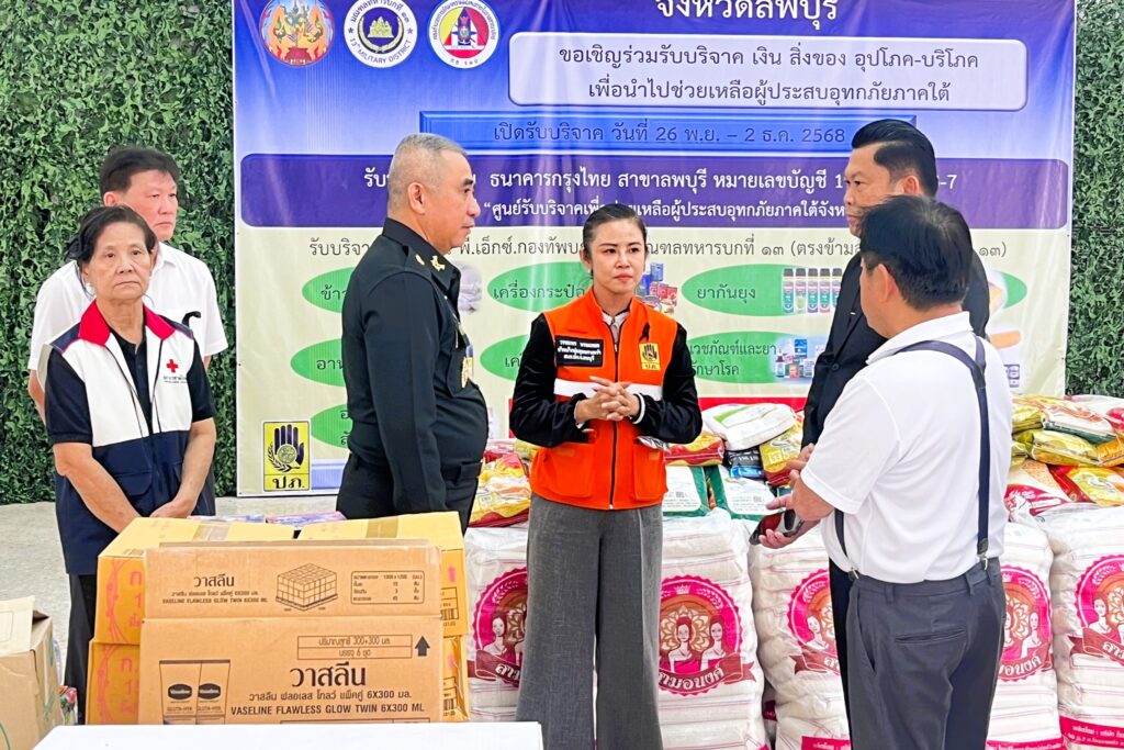 ทั้งนี้ จังหวัดลพบุรีได้เปิดรับบริจาค ตั้งแต่วันที่ 26 พฤศจิกายน จนถึง วันที่ 2 ธันวาคม 2568 ตั้งแต่เวลา 09.00 -16.00 น. ณ สถานีบริการน้ำมันเชื้อเพลิงเพื่อสวัสดิการ มณฑลทหารบกที่ 13 พี.เอ็กซ์. กองทัพบก สาขา มณฑลทหารบกที่ 13 (อาคาร PX ปตท. มทบ.13) สำหรับการบริจาคเงินสามารถบริจาคได้ที่บัญชี ธนาคารกรุงไทย สาขาลพบุรี เลขที่บัญชี 111-3-03463-7 ชื่อบัญชี ศูนย์รับบริจาคเพื่อช่วยเหลือผู้ประสบอุทกภัยภาคใต้จังหวัดลพบุรี